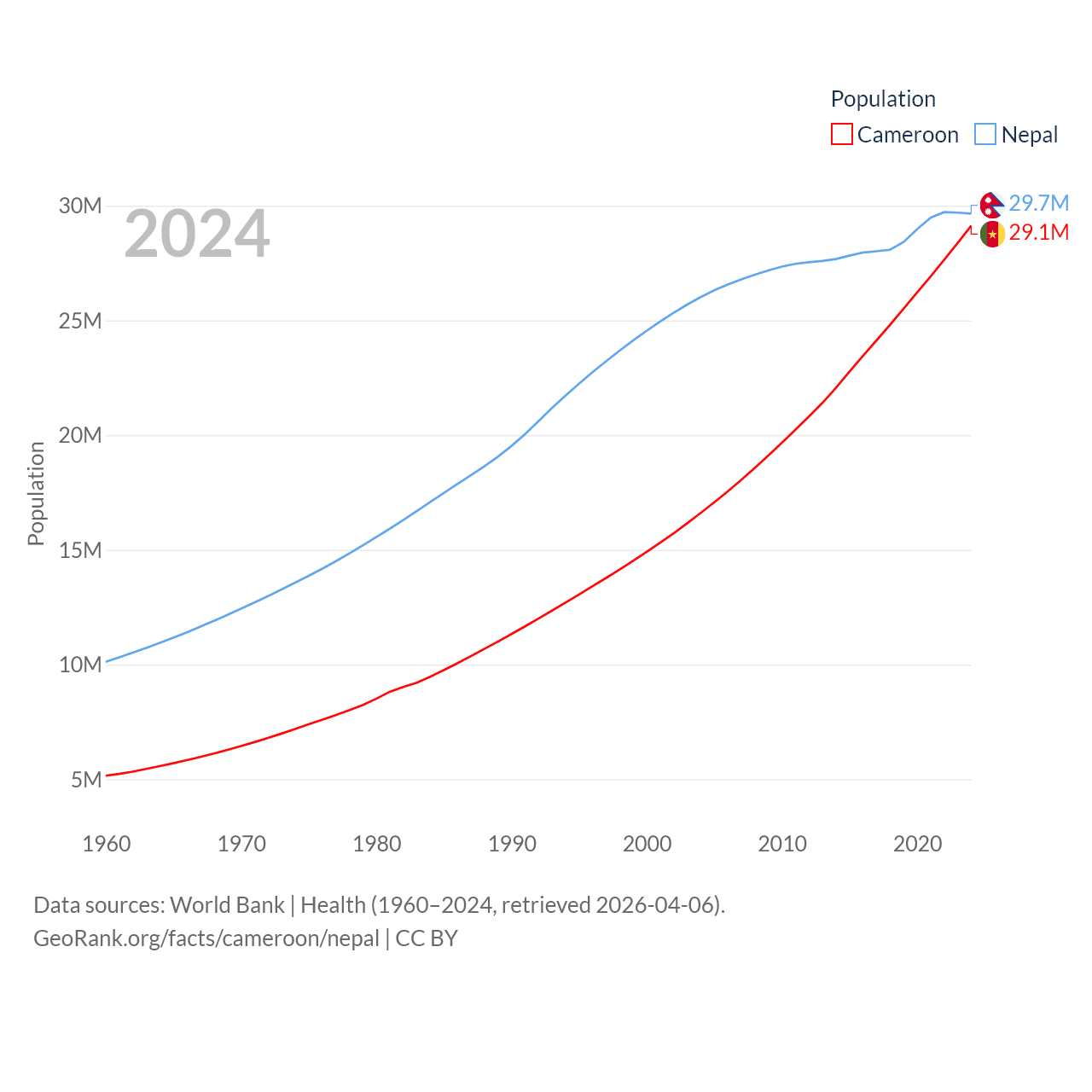 Cameroon has a population of 29.1M (ranked 52/197), compared with 29.7M in Nepal (ranked 51/197). Cameroon's land area is 182,514 sq mi versus 55,348 sq mi for Nepal (ranked 52nd vs. 92nd).