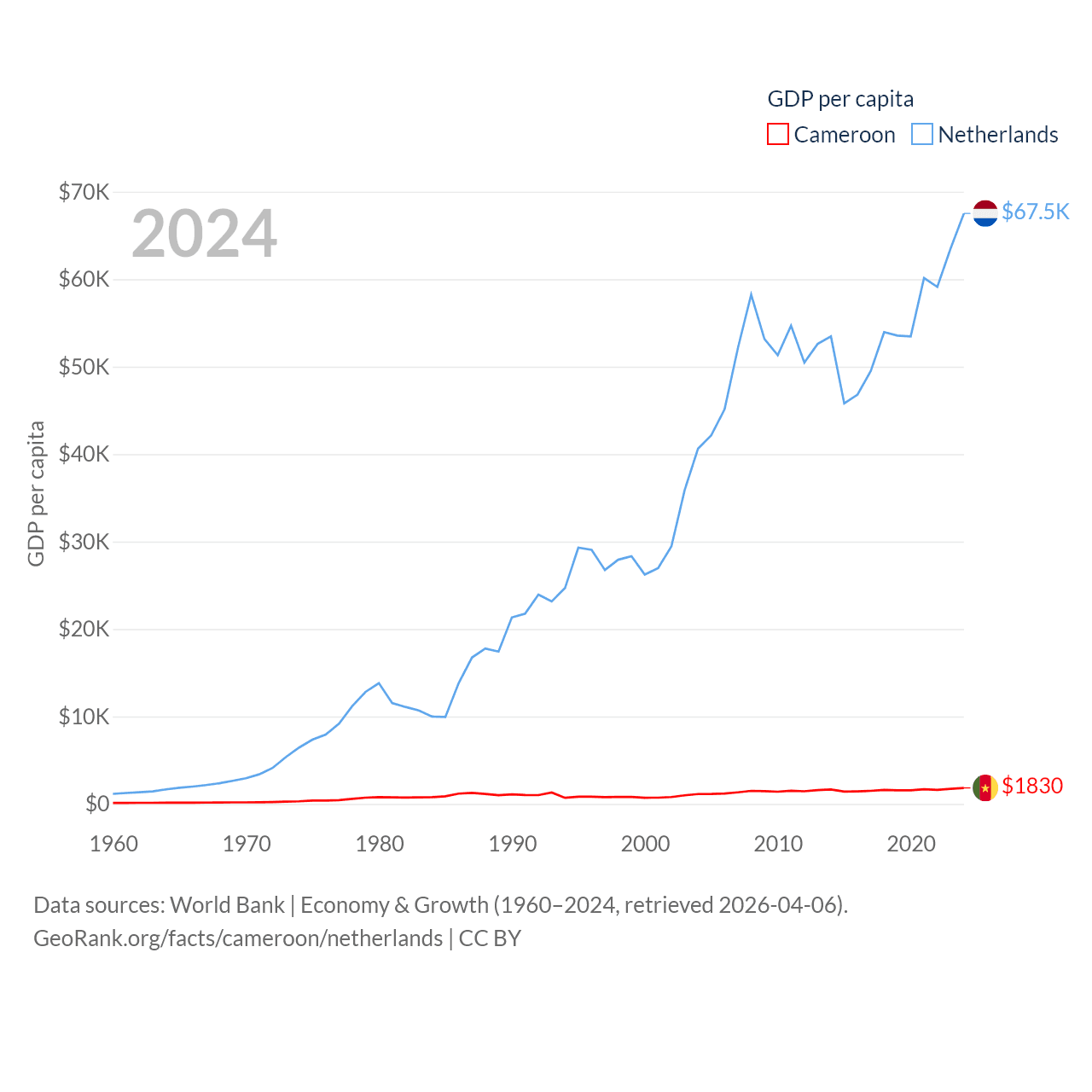 By GDP, Cameroon ranks 91/197 ($53.3B) and The Netherlands ranks 19/197 ($1.21T). By GDP per capita, Cameroon ranks 158/197 ($1,830), while The Netherlands ranks 13/197 ($67,520).