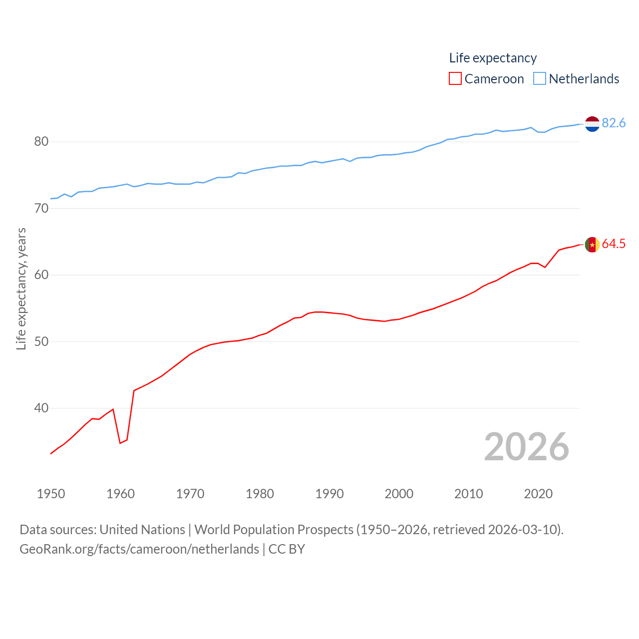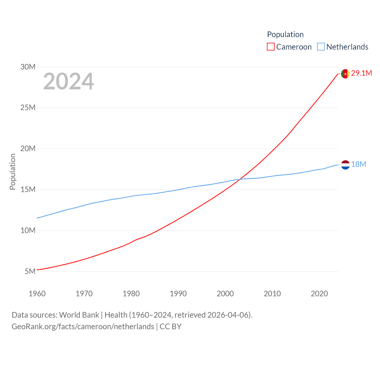 Cameroon has a population of 29.1M (ranked 52/197), compared with 18M in The Netherlands (ranked 72/197). Cameroon's land area is 182,514 sq mi versus 13,000 sq mi for The Netherlands (ranked 52nd vs. 134th).