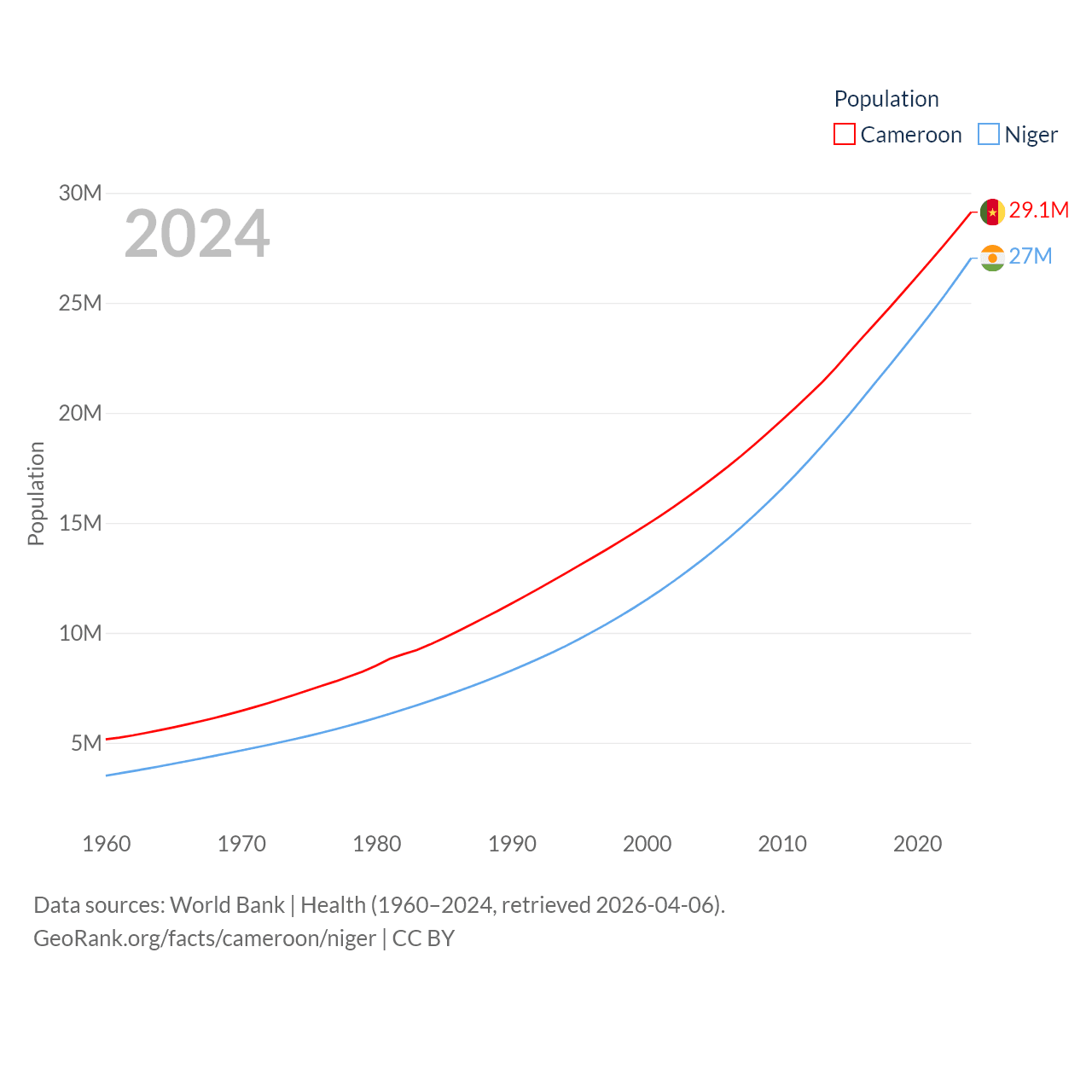 Cameroon has a population of 29.1M (ranked 52/197), compared with 27M in Niger (ranked 55/197). Cameroon's land area is 182,514 sq mi versus 489,076 sq mi for Niger (ranked 52nd vs. 20th).