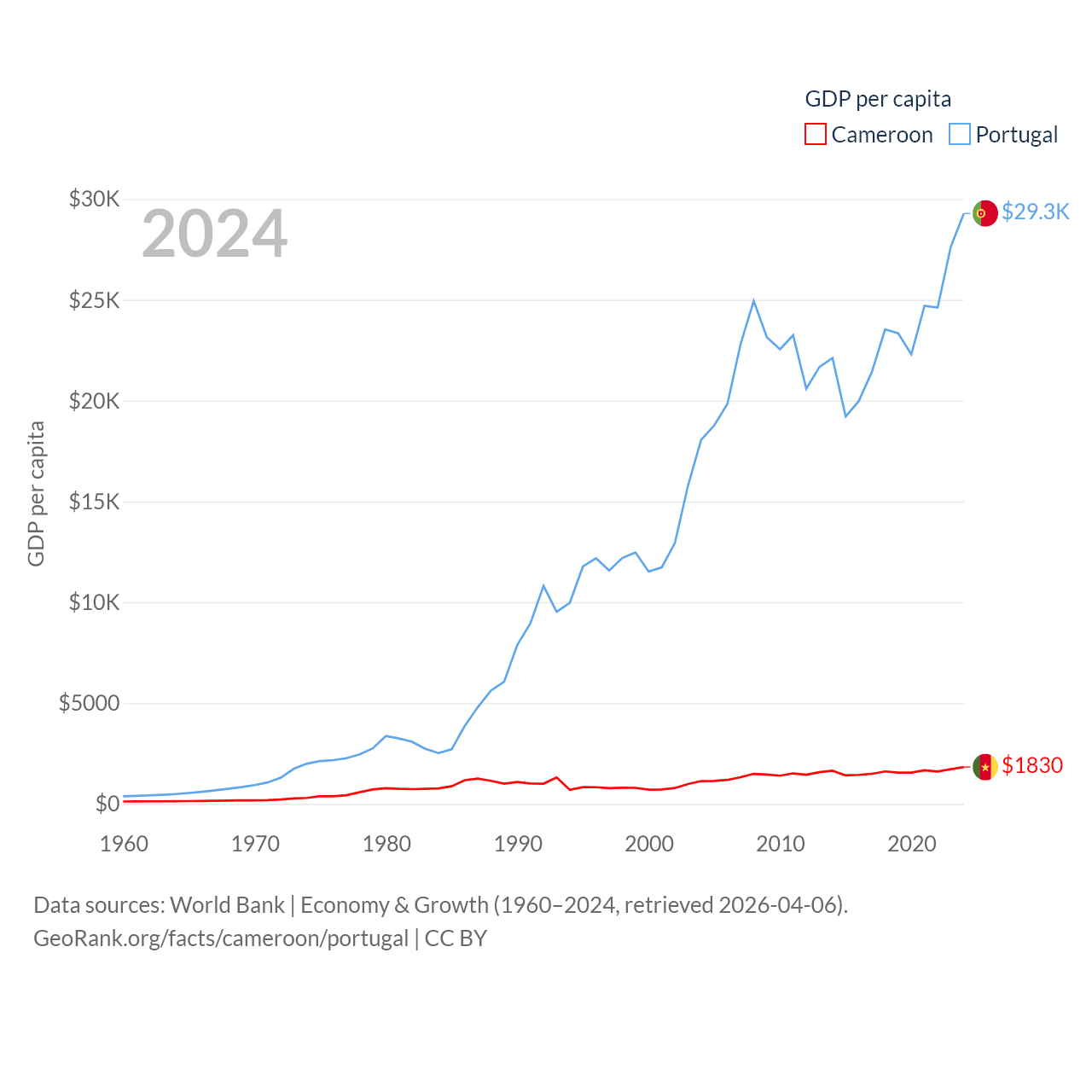By GDP, Cameroon ranks 91/197 ($53.3B) and Portugal ranks 46/197 ($313B). By GDP per capita, Cameroon ranks 158/197 ($1,830), while Portugal ranks 44/197 ($29,292).