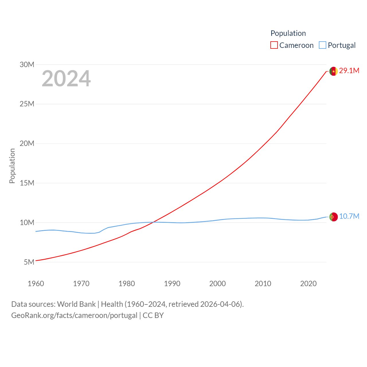 Cameroon has a population of 29.1M (ranked 52/197), compared with 10.7M in Portugal (ranked 90/197). Cameroon's land area is 182,514 sq mi versus 35,369 sq mi for Portugal (ranked 52nd vs. 108th).