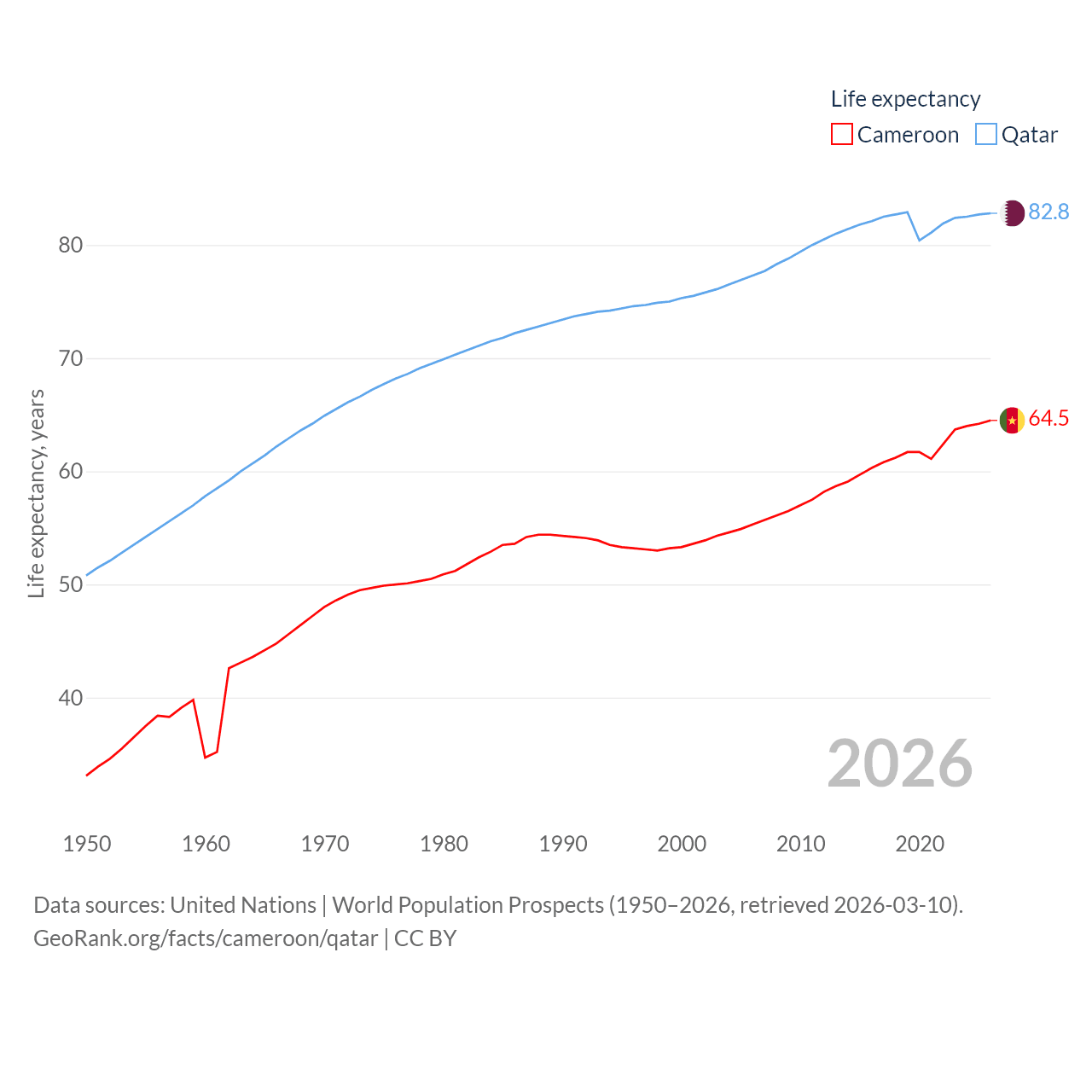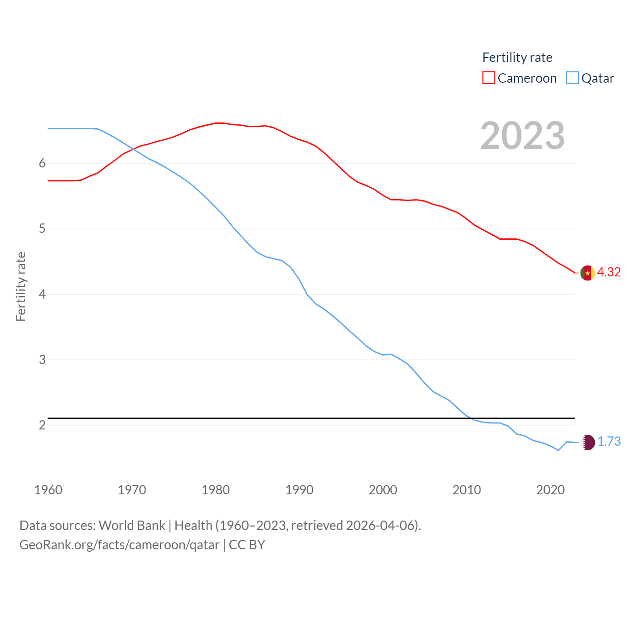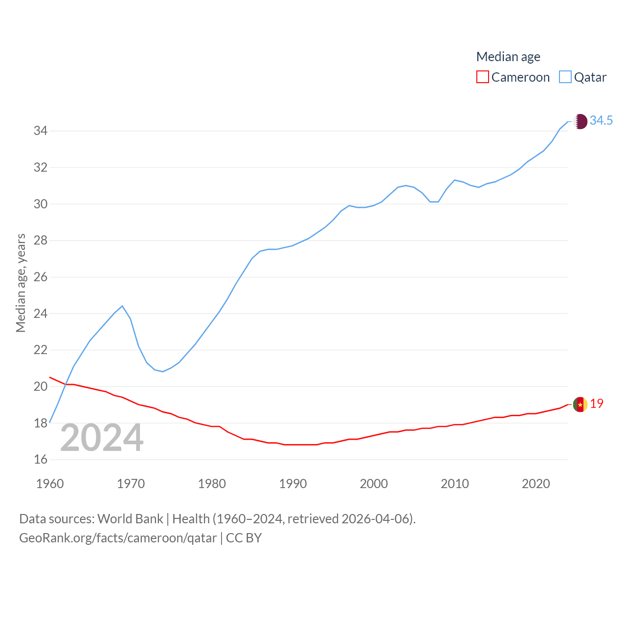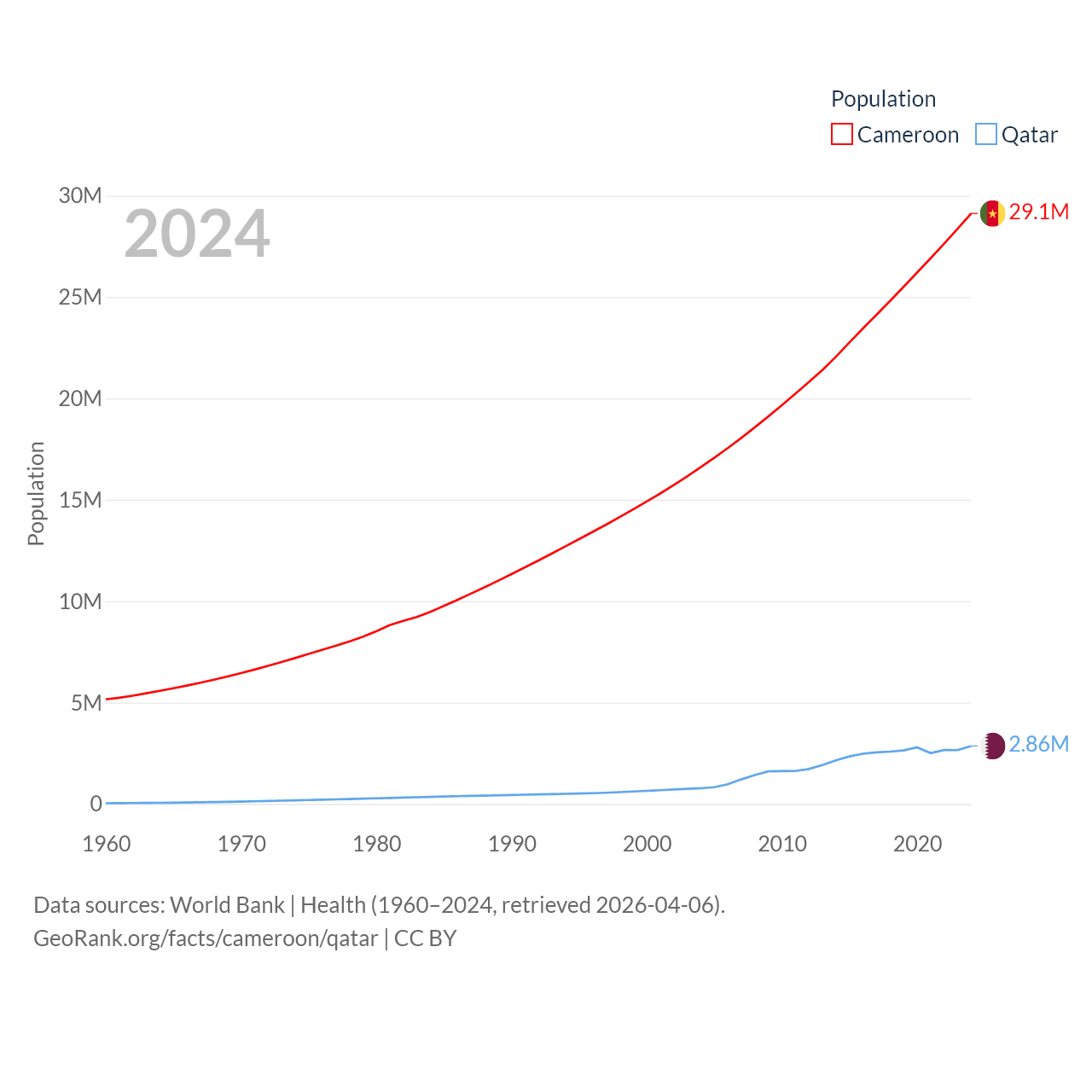 Cameroon has a population of 29.1M (ranked 52/197), compared with 2.86M in Qatar (ranked 138/197). Cameroon's land area is 182,514 sq mi versus 4,436 sq mi for Qatar (ranked 52nd vs. 158th).