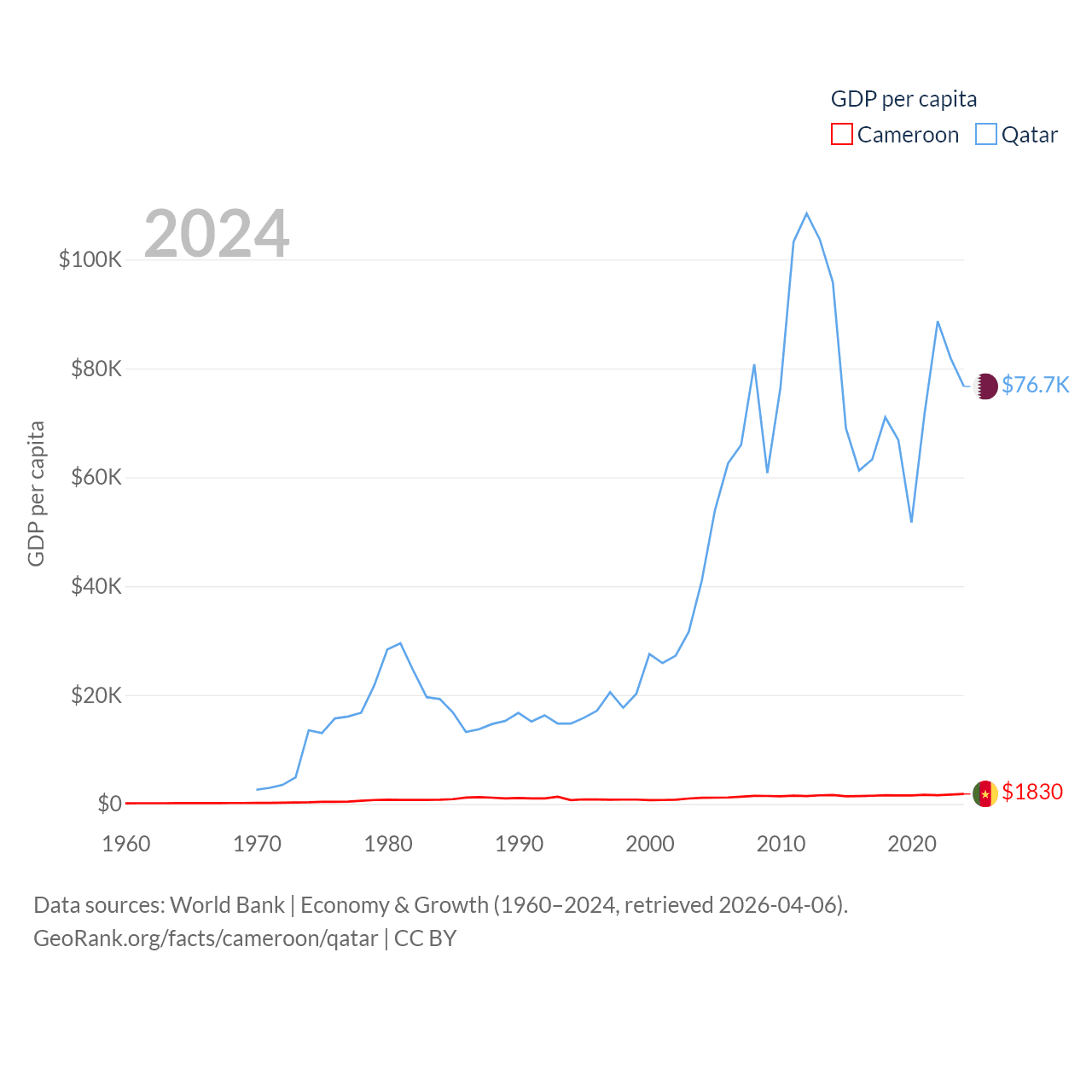 By GDP, Cameroon ranks 91/197 ($53.3B) and Qatar ranks 56/197 ($219B). By GDP per capita, Cameroon ranks 158/197 ($1,830), while Qatar ranks 11/197 ($76,689).