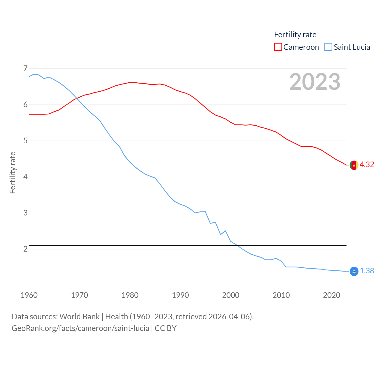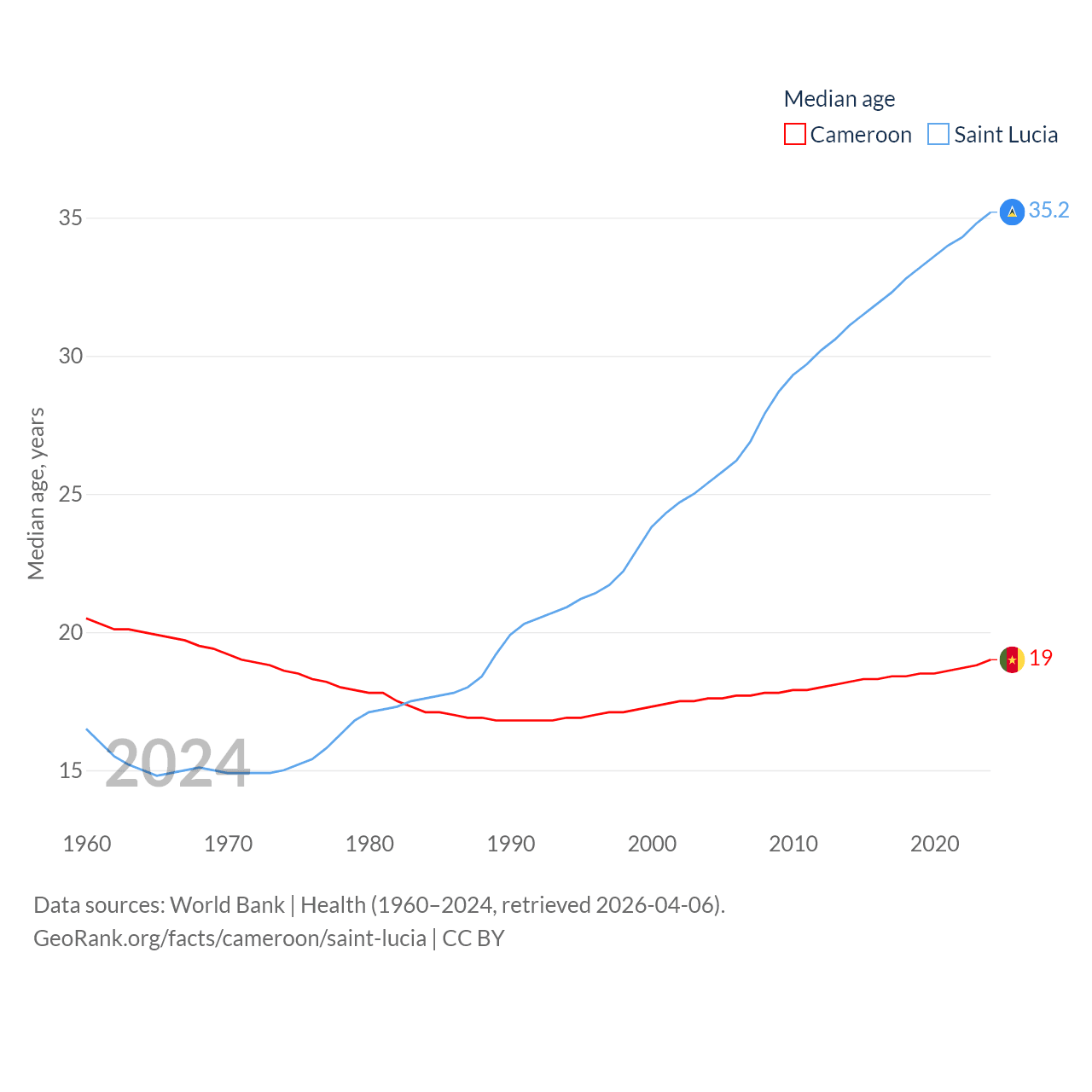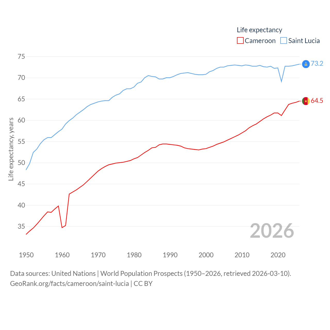 Cameroon has a population of 29.1M (ranked 52/197), compared with 180K in Saint Lucia (ranked 178/197). Cameroon's land area is 182,514 sq mi versus 235.5 sq mi for Saint Lucia (ranked 52nd vs. 178th).