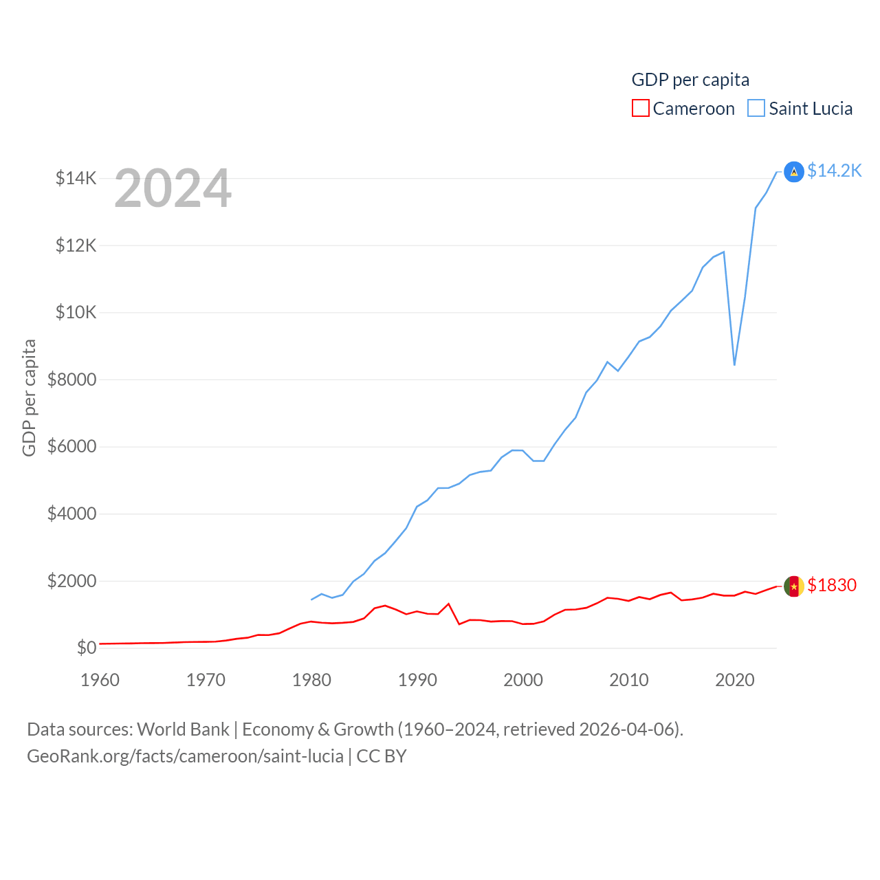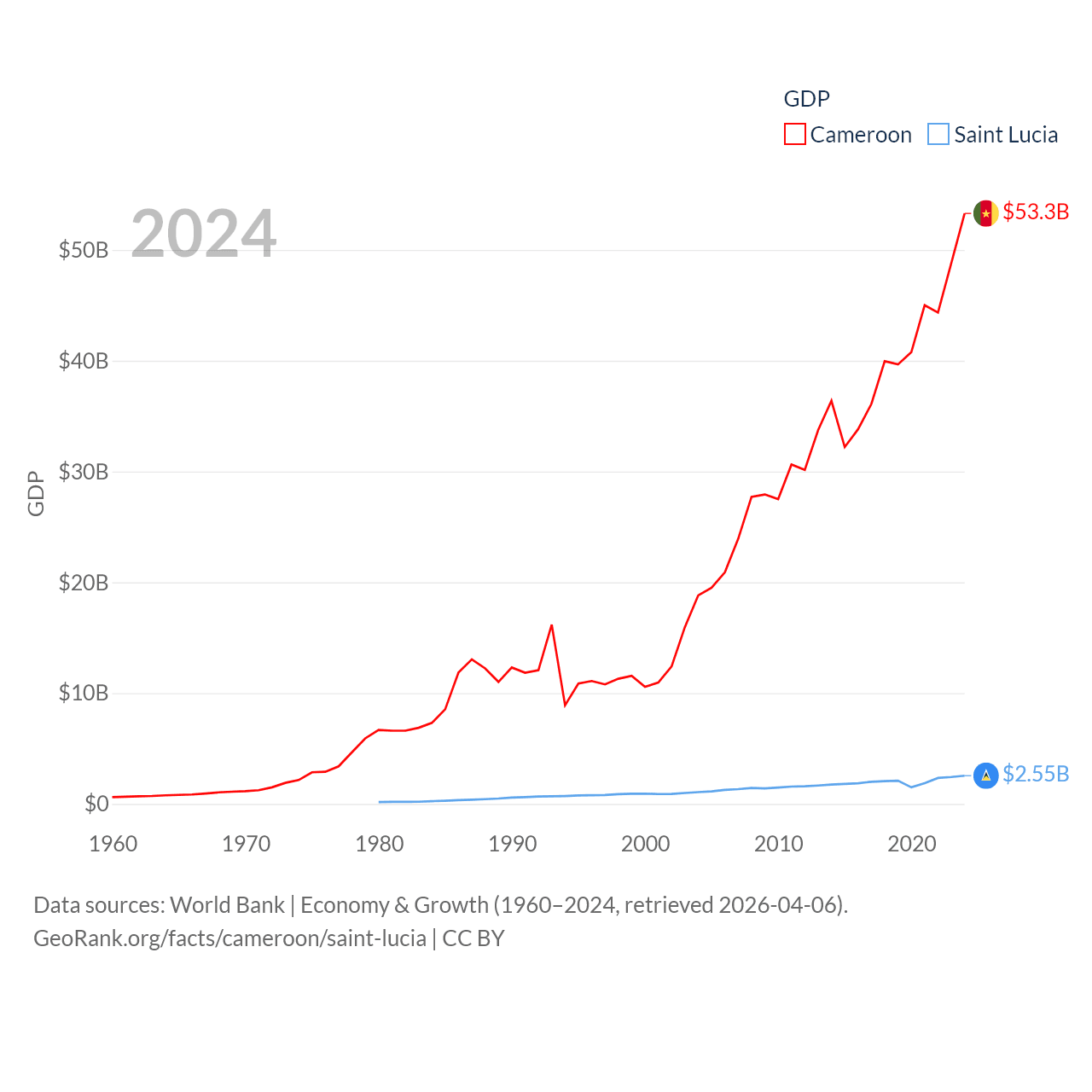 By GDP, Cameroon ranks 91/197 ($53.3B) and Saint Lucia ranks 173/197 ($2.55B). By GDP per capita, Cameroon ranks 158/197 ($1,830), while Saint Lucia ranks 70/197 ($14,182).