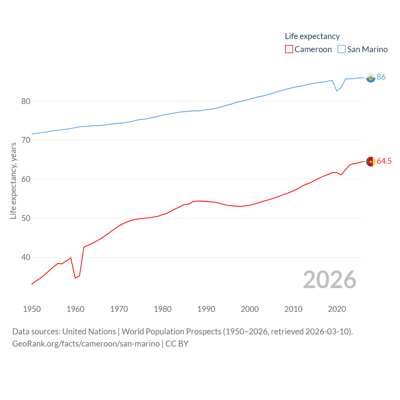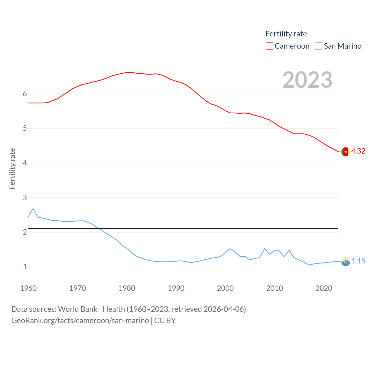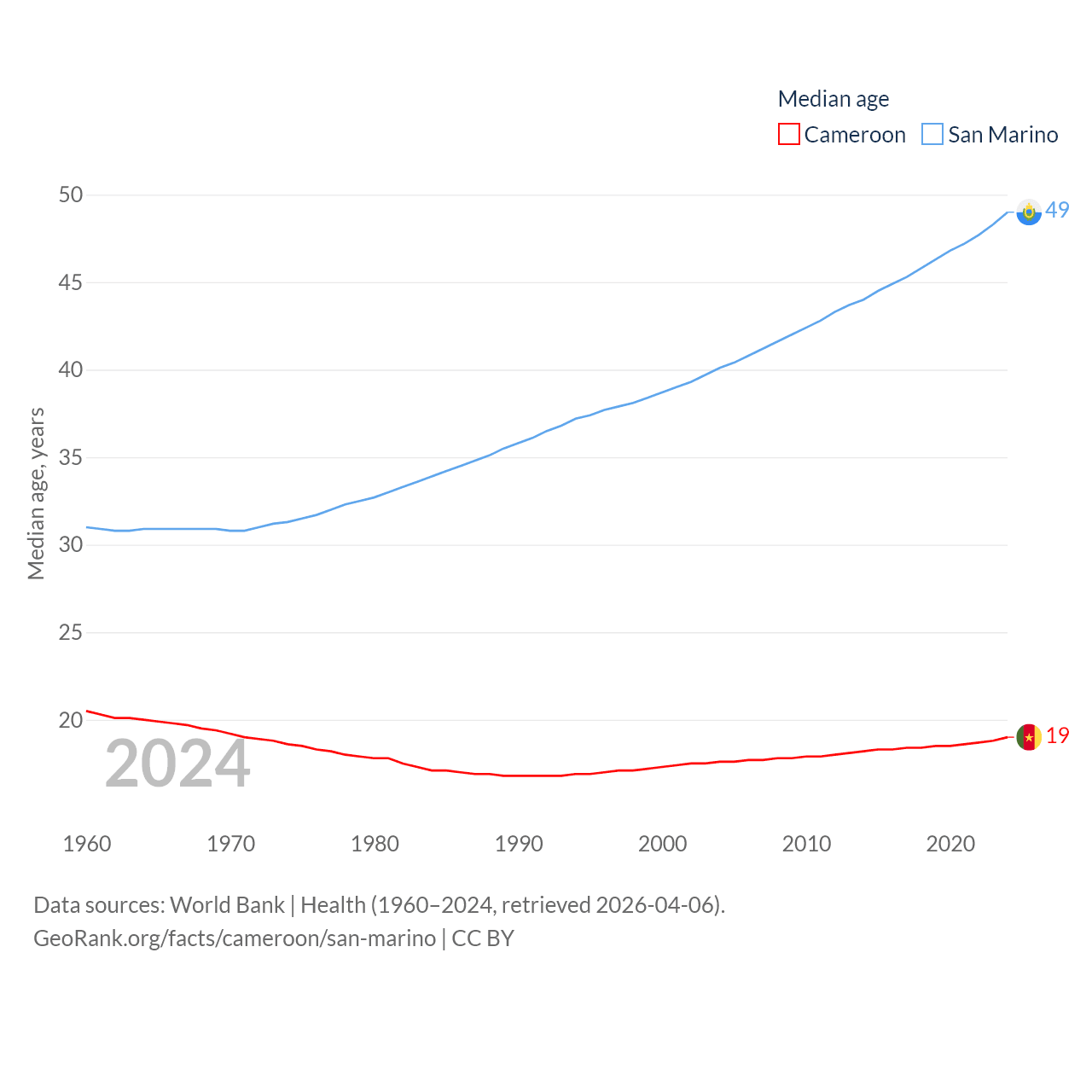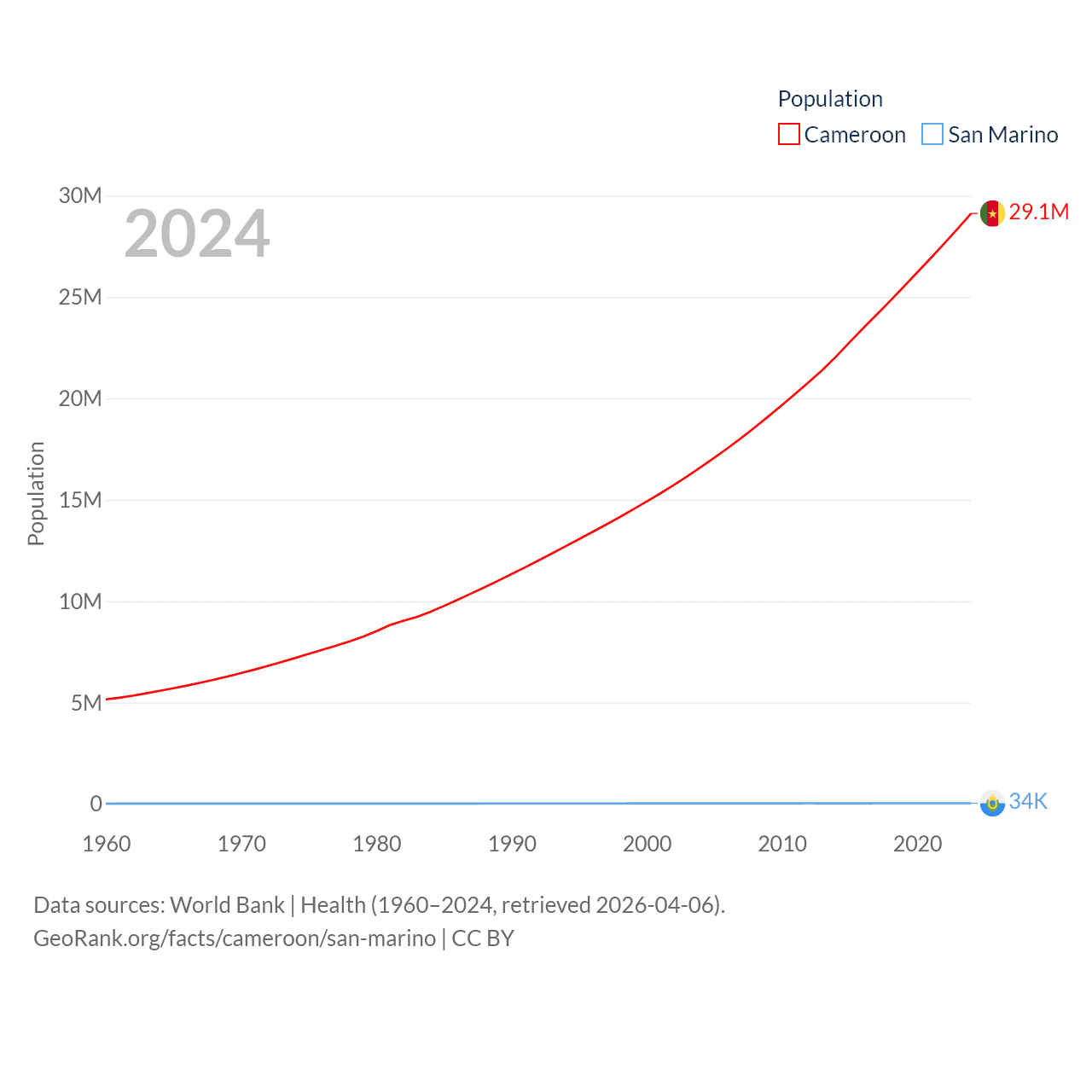 Cameroon has a population of 29.1M (ranked 52/197), compared with 34K in San Marino (ranked 193/197). Cameroon's land area is 182,514 sq mi versus 23.2 sq mi for San Marino (ranked 52nd vs. 193rd).
