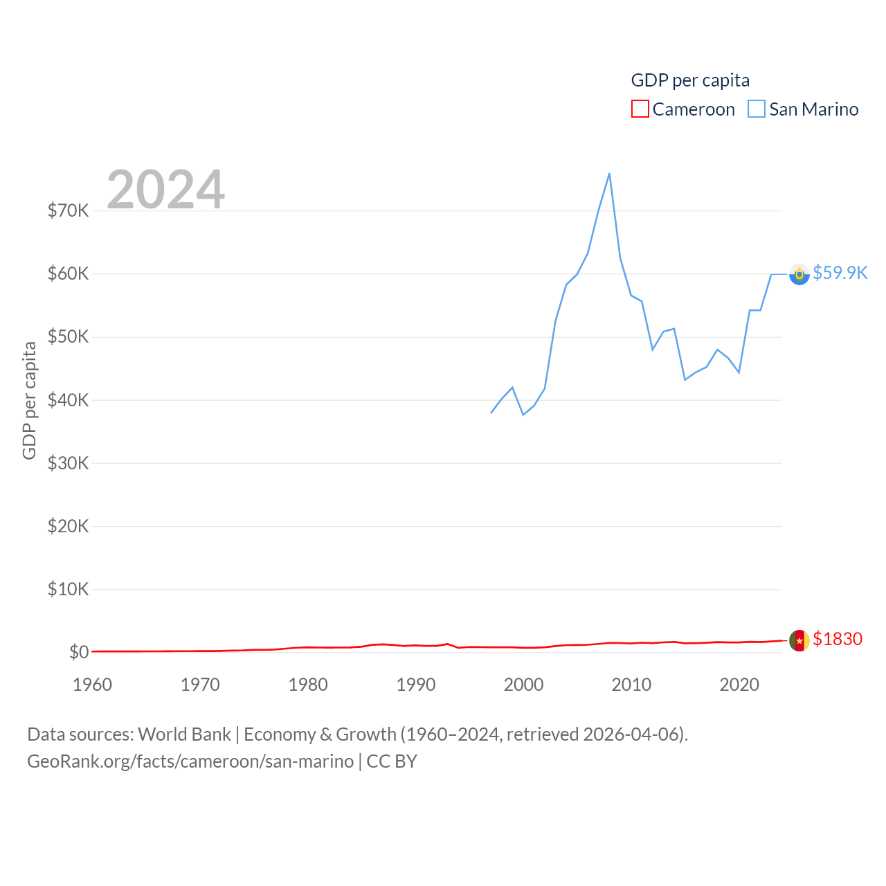 By GDP, Cameroon ranks 91/197 ($53.3B) and San Marino ranks 180/197 ($2.03B). By GDP per capita, Cameroon ranks 158/197 ($1,830), while San Marino ranks 15/197 ($59,880).