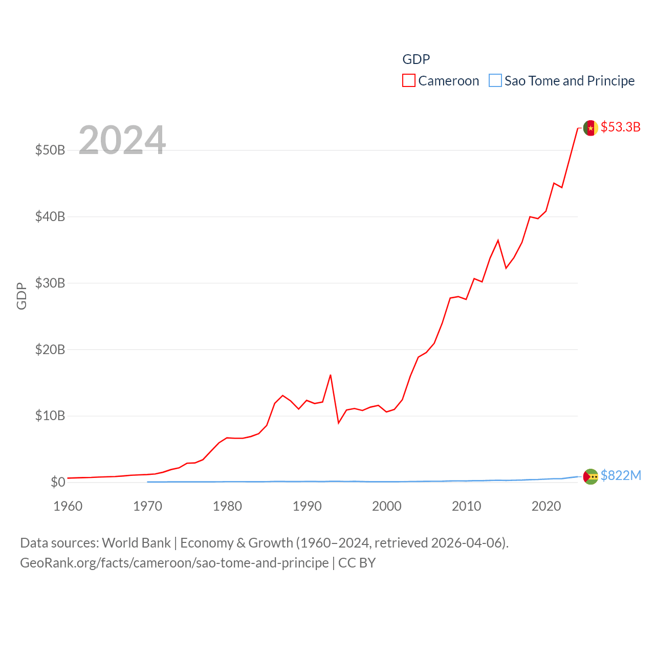 By GDP, Cameroon ranks 91/197 ($53.3B) and Sao Tome and Principe ranks 189/197 ($822M). By GDP per capita, Cameroon ranks 158/197 ($1,830), while Sao Tome and Principe ranks 134/197 ($3,491).
