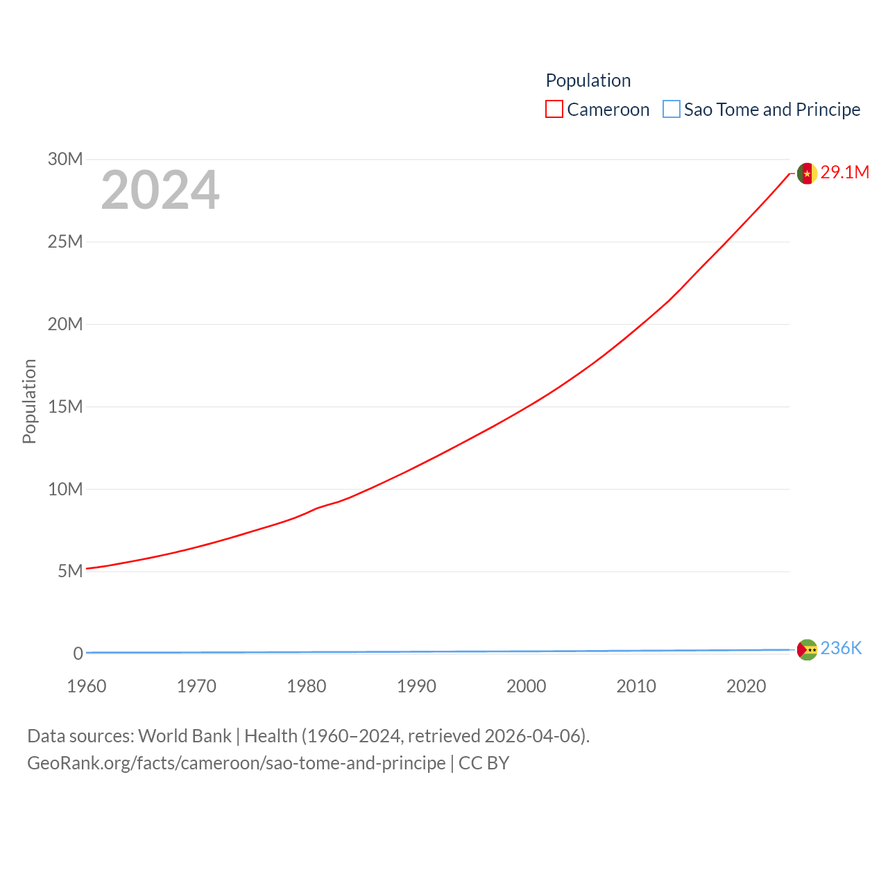 Cameroon has a population of 29.1M (ranked 52/197), compared with 236K in Sao Tome and Principe (ranked 176/197). Cameroon's land area is 182,514 sq mi versus 371 sq mi for Sao Tome and Principe (ranked 52nd vs. 172nd).