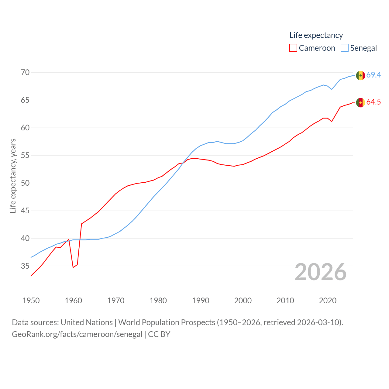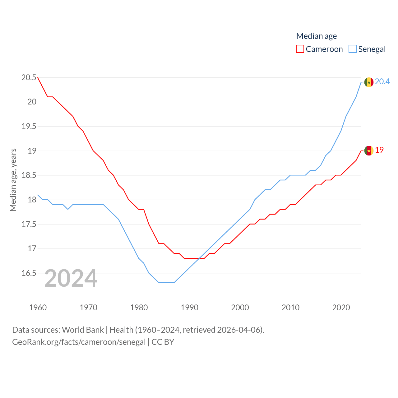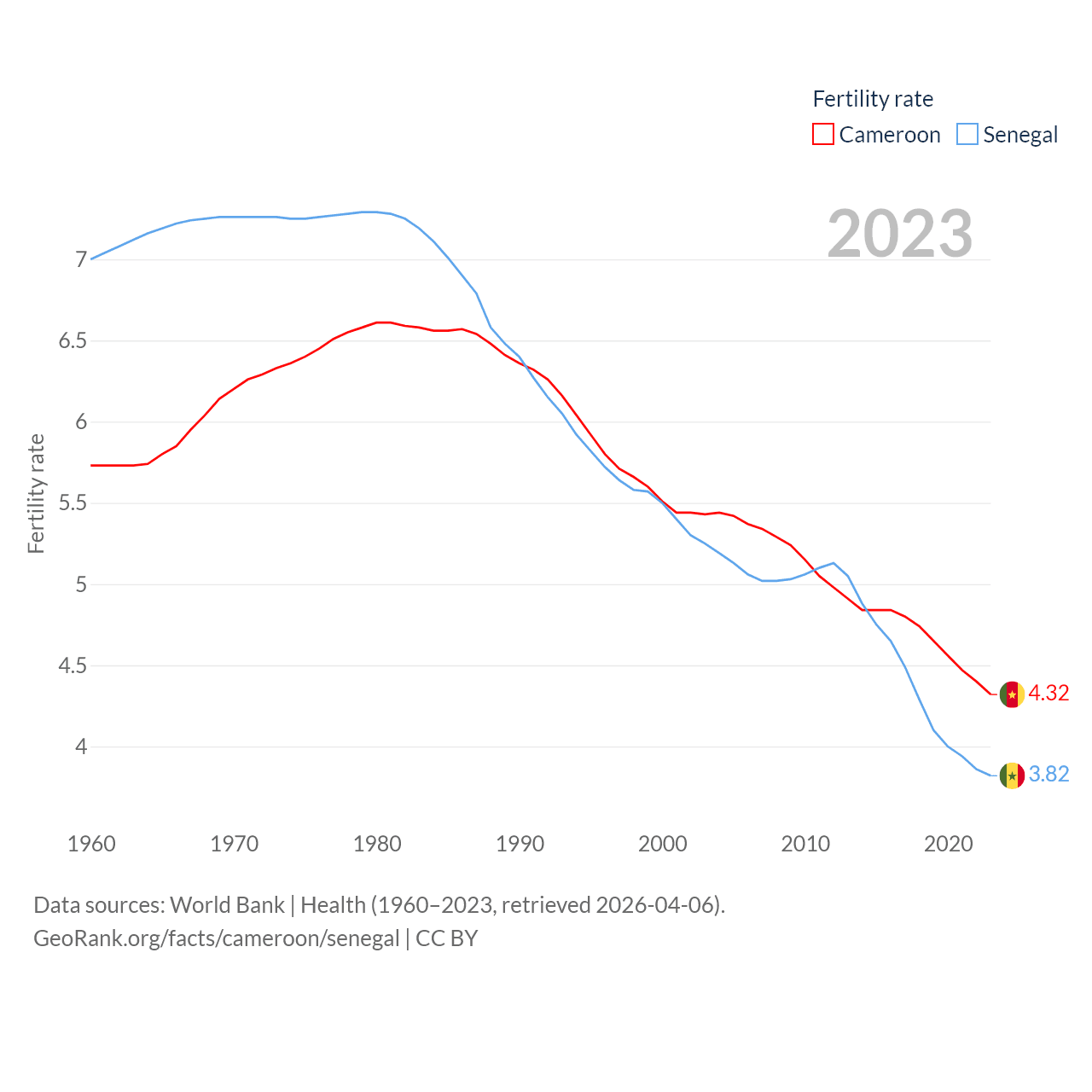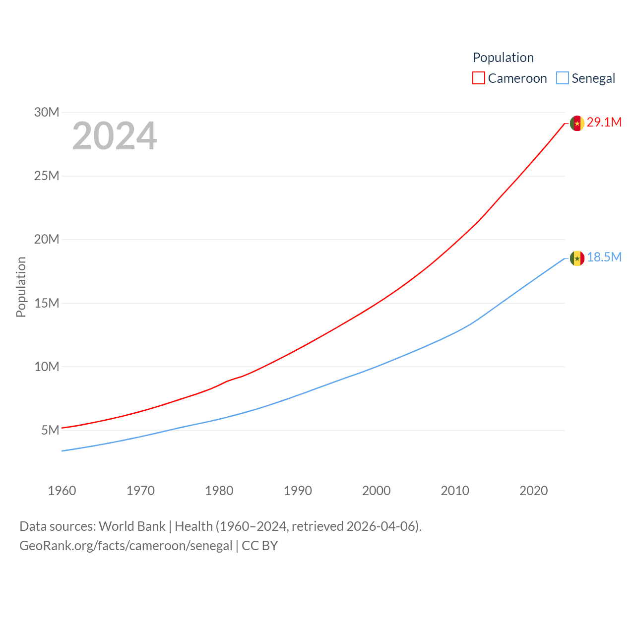 Cameroon has a population of 29.1M (ranked 52/197), compared with 18.5M in Senegal (ranked 69/197). Cameroon's land area is 182,514 sq mi versus 74,336 sq mi for Senegal (ranked 52nd vs. 85th).