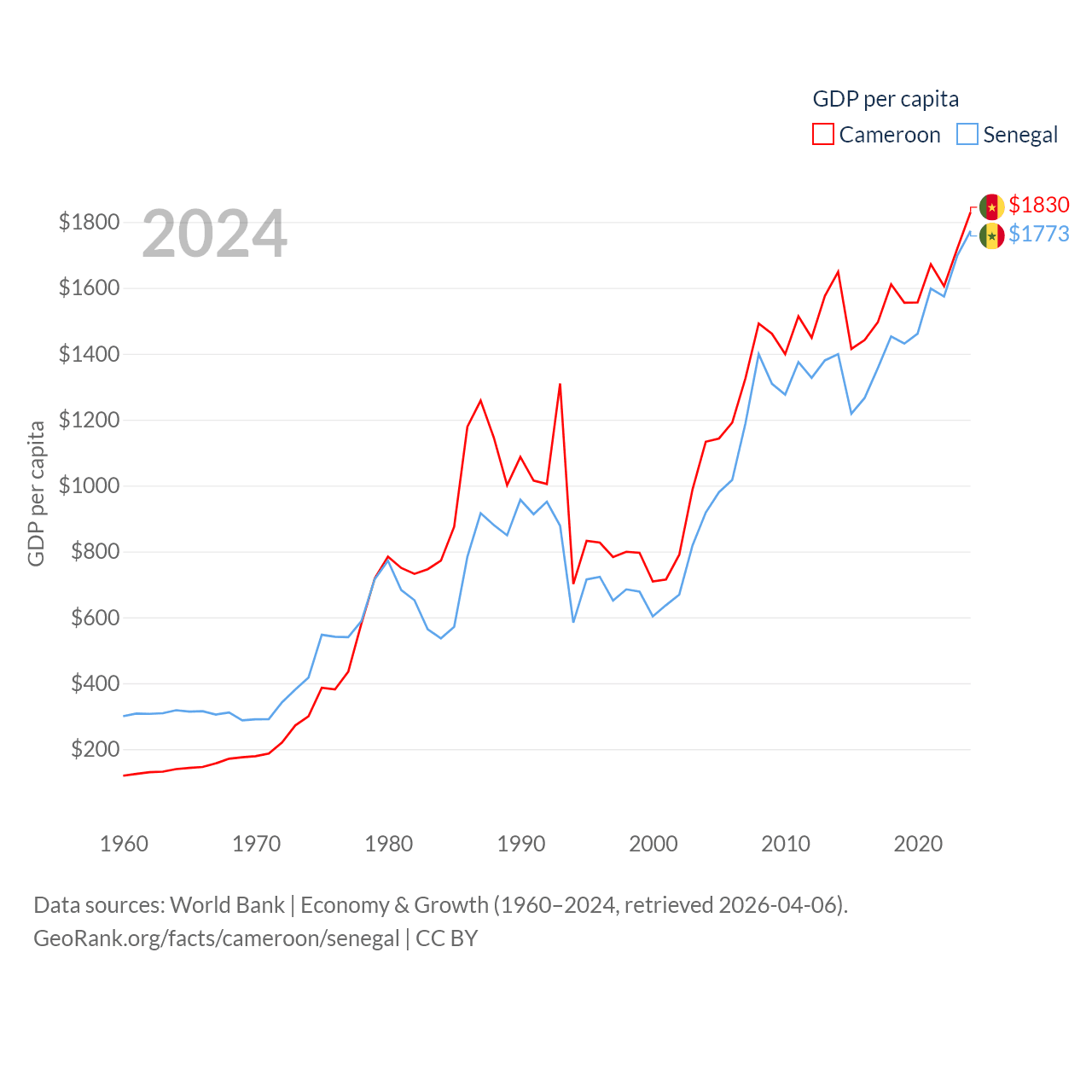 By GDP, Cameroon ranks 91/197 ($53.3B) and Senegal ranks 109/197 ($32.8B). By GDP per capita, Cameroon ranks 158/197 ($1,830), while Senegal ranks 159/197 ($1,773).