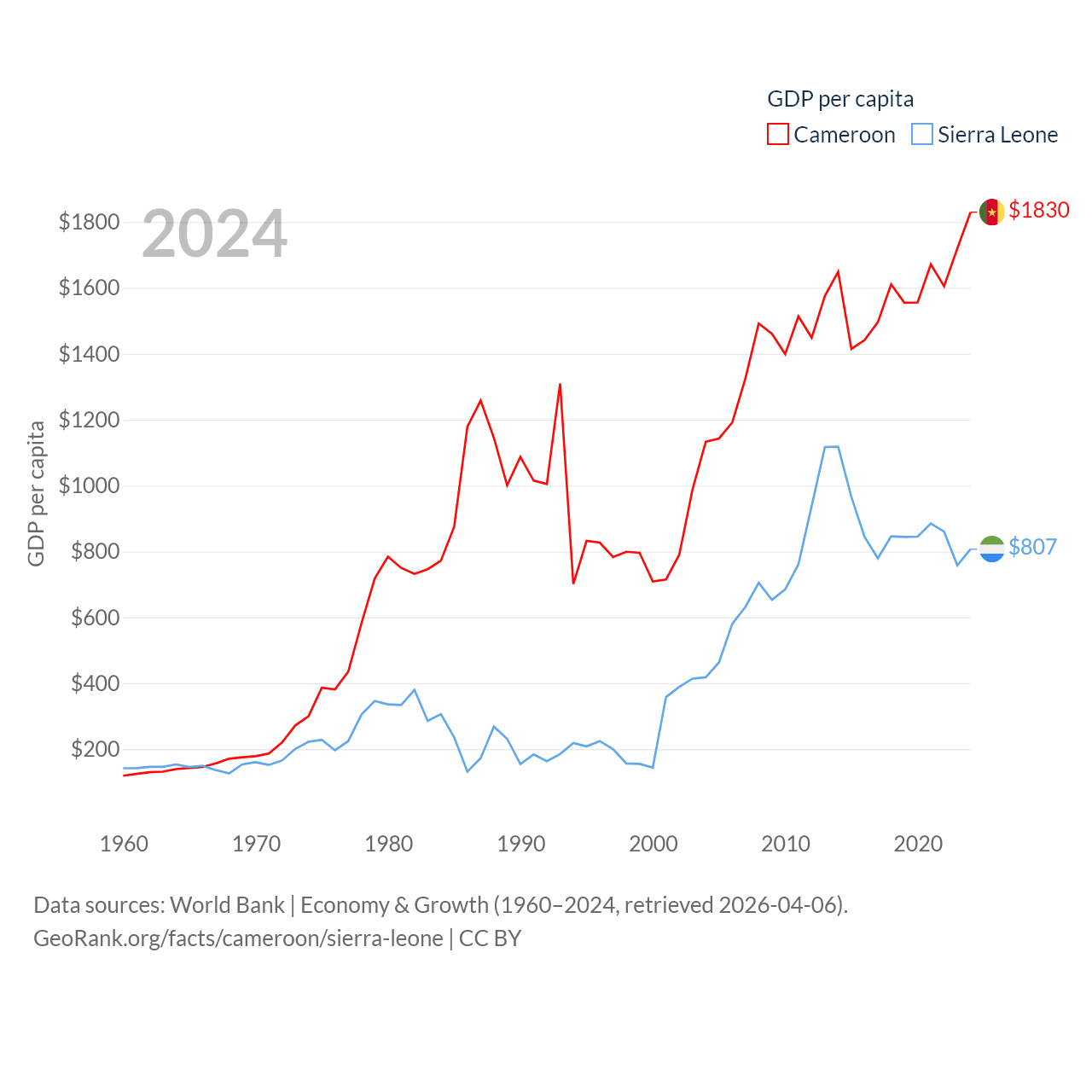By GDP, Cameroon ranks 91/197 ($53.3B) and Sierra Leone ranks 160/197 ($6.97B). By GDP per capita, Cameroon ranks 158/197 ($1,830), while Sierra Leone ranks 186/197 ($807).