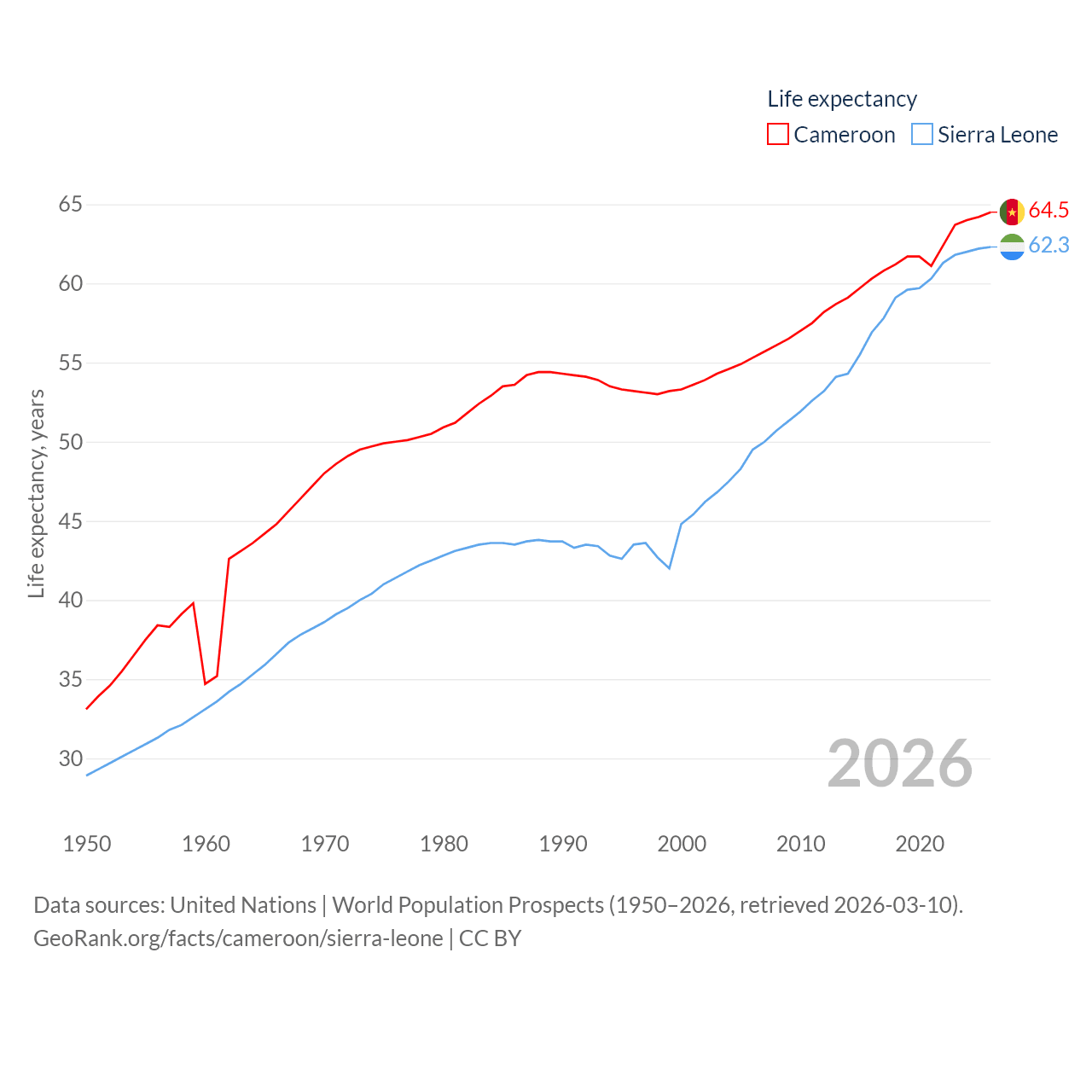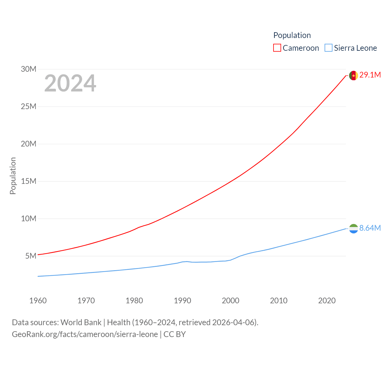 Cameroon has a population of 29.1M (ranked 52/197), compared with 8.64M in Sierra Leone (ranked 102/197). Cameroon's land area is 182,514 sq mi versus 27,869 sq mi for Sierra Leone (ranked 52nd vs. 116th).