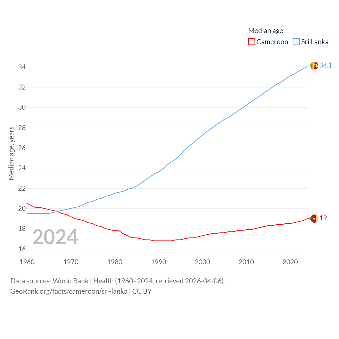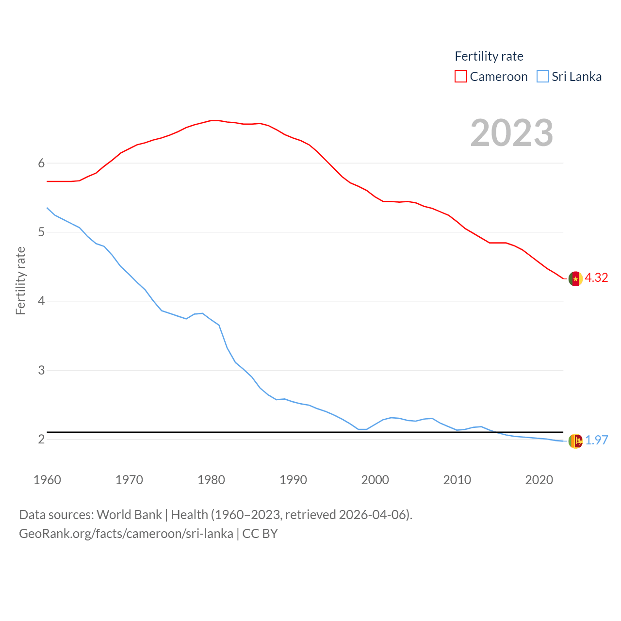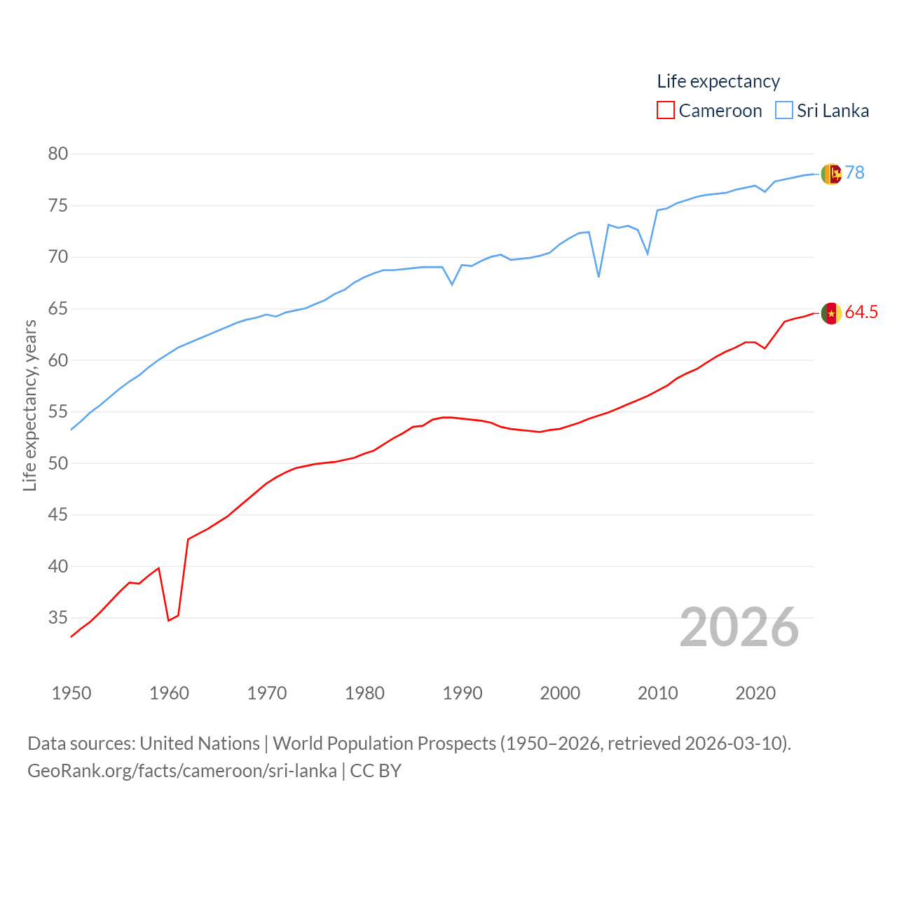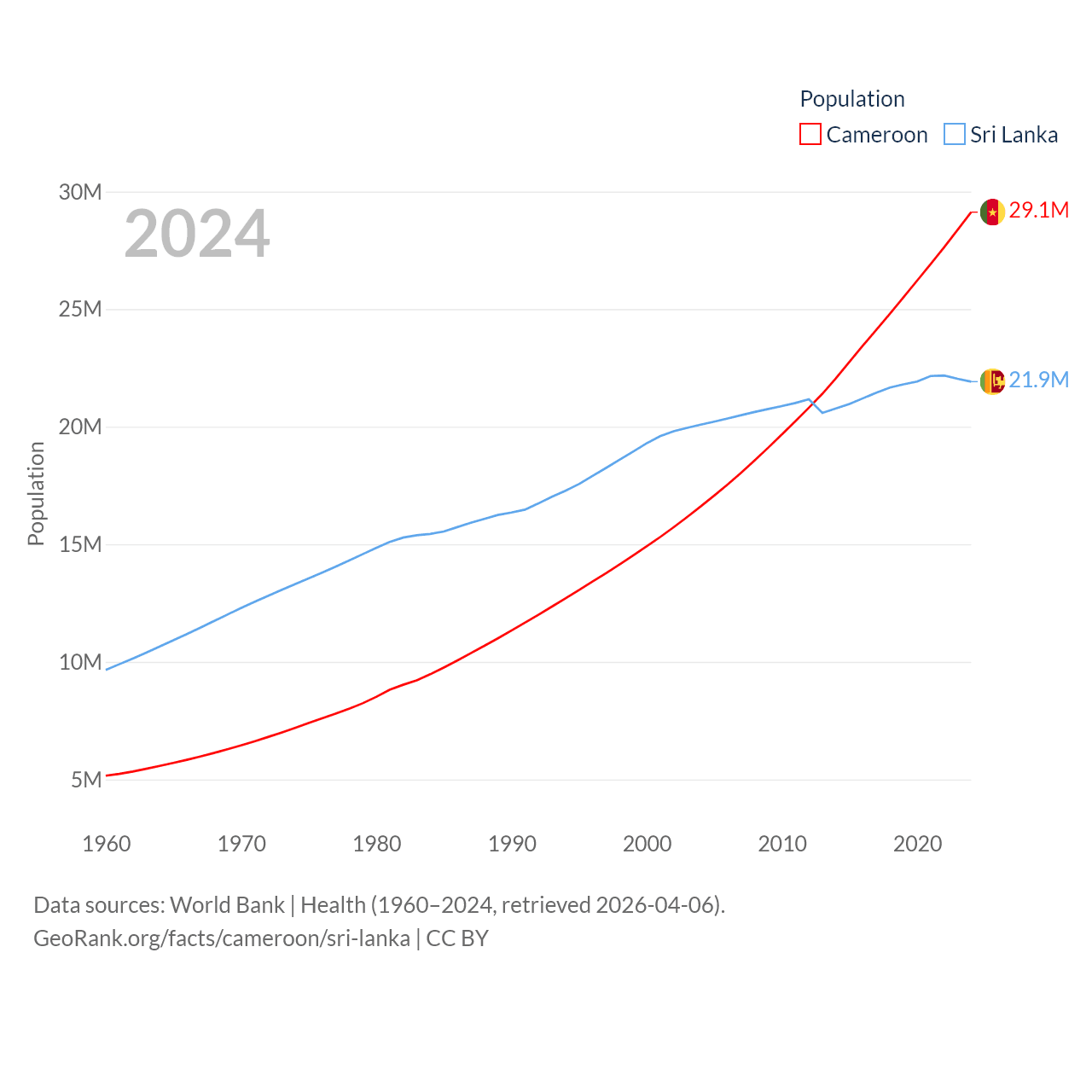 Cameroon has a population of 29.1M (ranked 52/197), compared with 21.9M in Sri Lanka (ranked 61/197). Cameroon's land area is 182,514 sq mi versus 23,884 sq mi for Sri Lanka (ranked 52nd vs. 122nd).