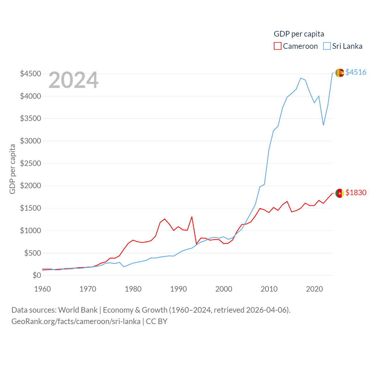 By GDP, Cameroon ranks 91/197 ($53.3B) and Sri Lanka ranks 72/197 ($99B). By GDP per capita, Cameroon ranks 158/197 ($1,830), while Sri Lanka ranks 124/197 ($4,516).