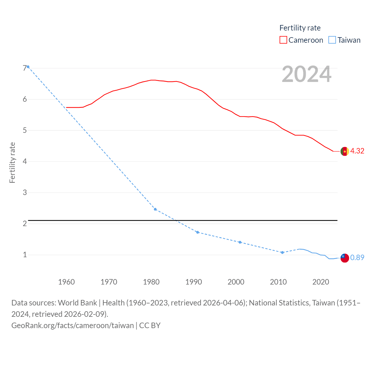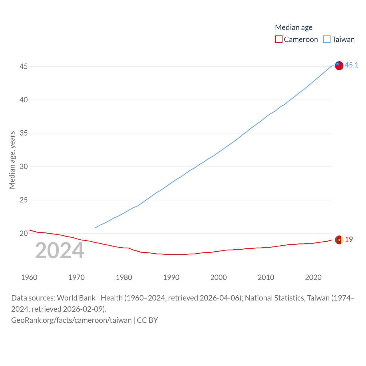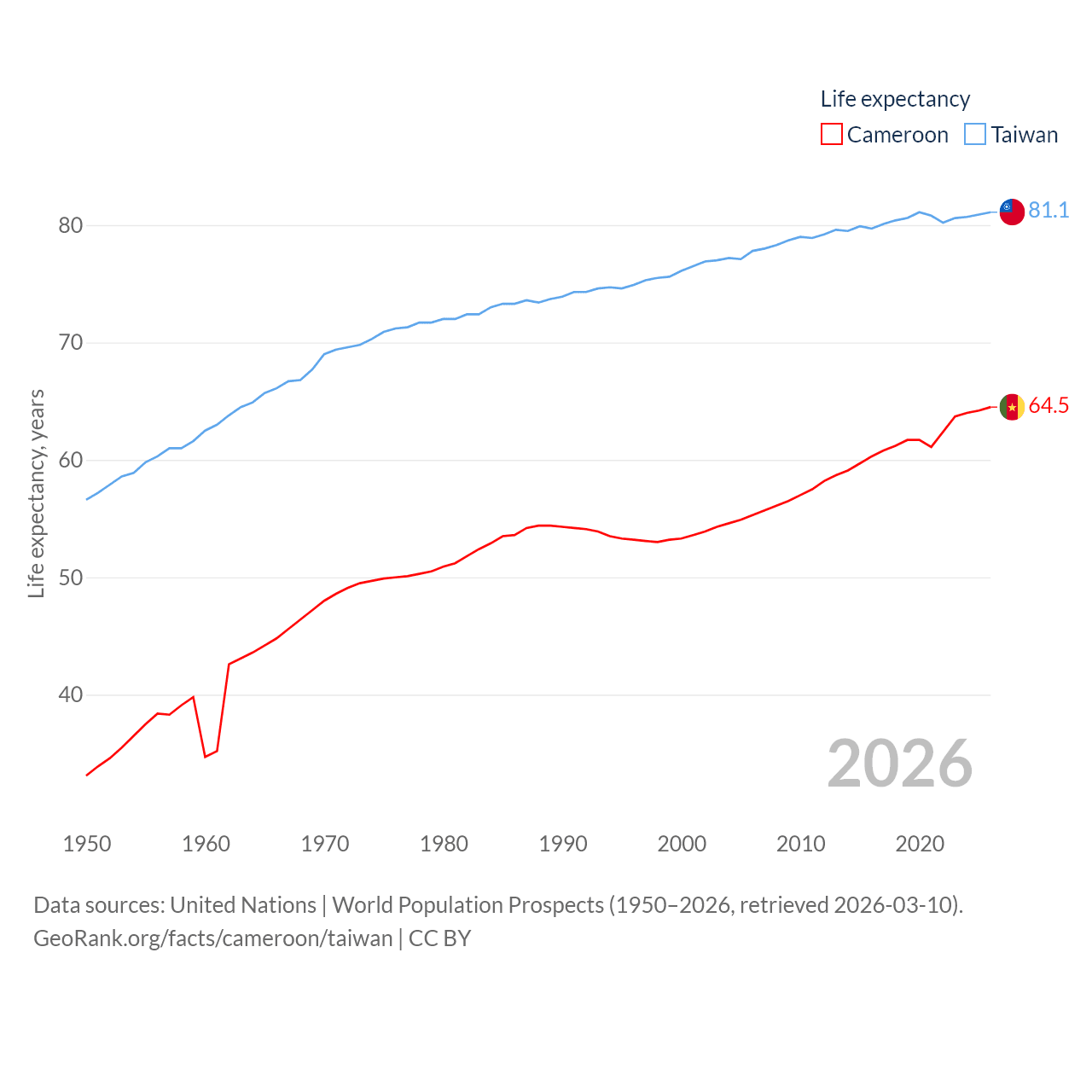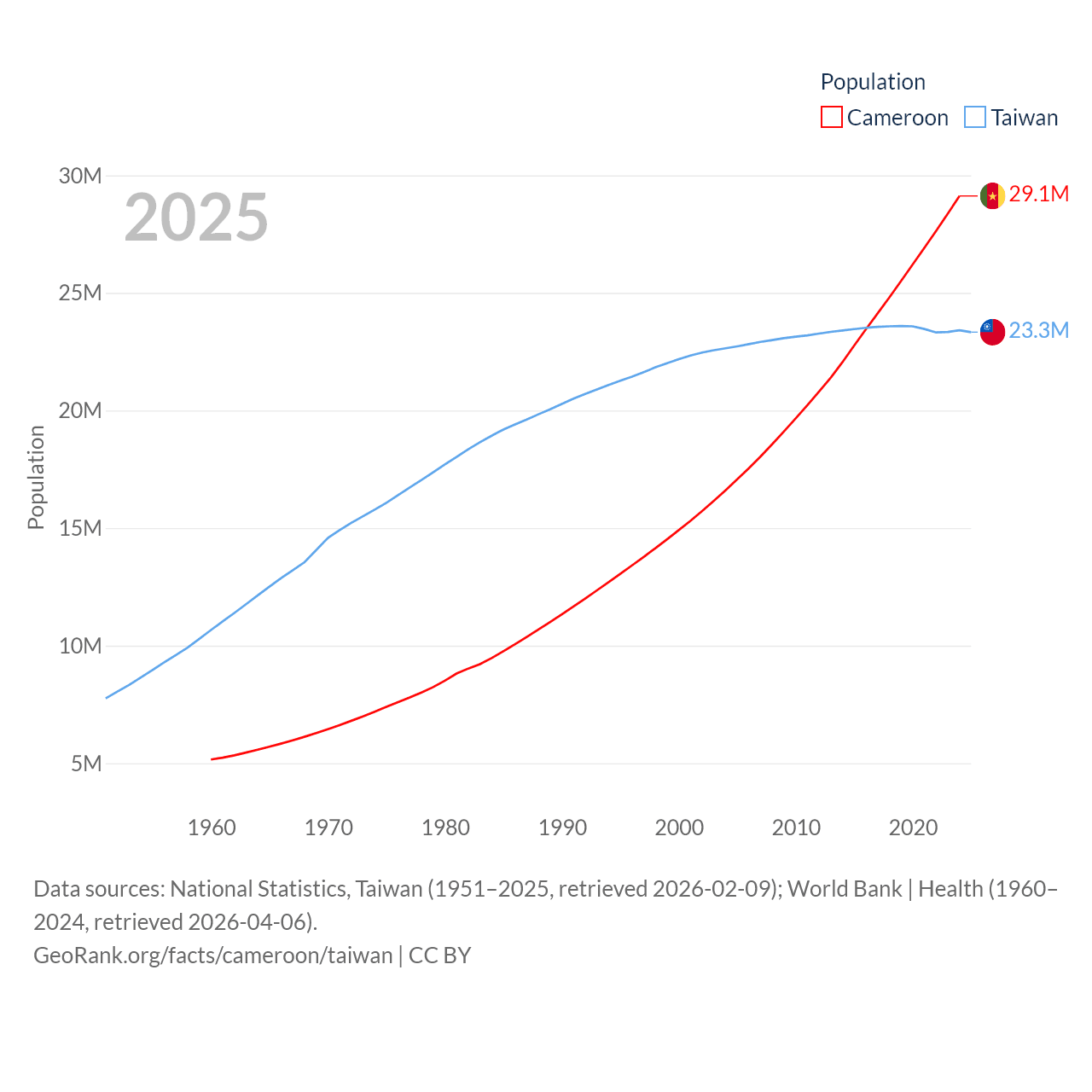 Cameroon has a population of 29.1M (ranked 52/197), compared with 23.3M in Taiwan (ranked 60/197). Cameroon's land area is 182,514 sq mi versus 13,976 sq mi for Taiwan (ranked 52nd vs. 133rd).