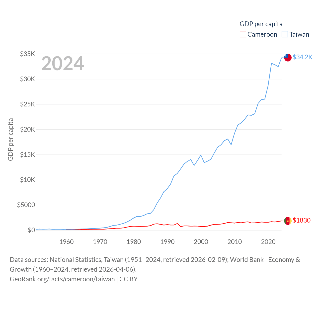 By GDP, Cameroon ranks 91/197 ($53.3B) and Taiwan ranks 22/197 ($802B). By GDP per capita, Cameroon ranks 158/197 ($1,830), while Taiwan ranks 35/197 ($34,238).