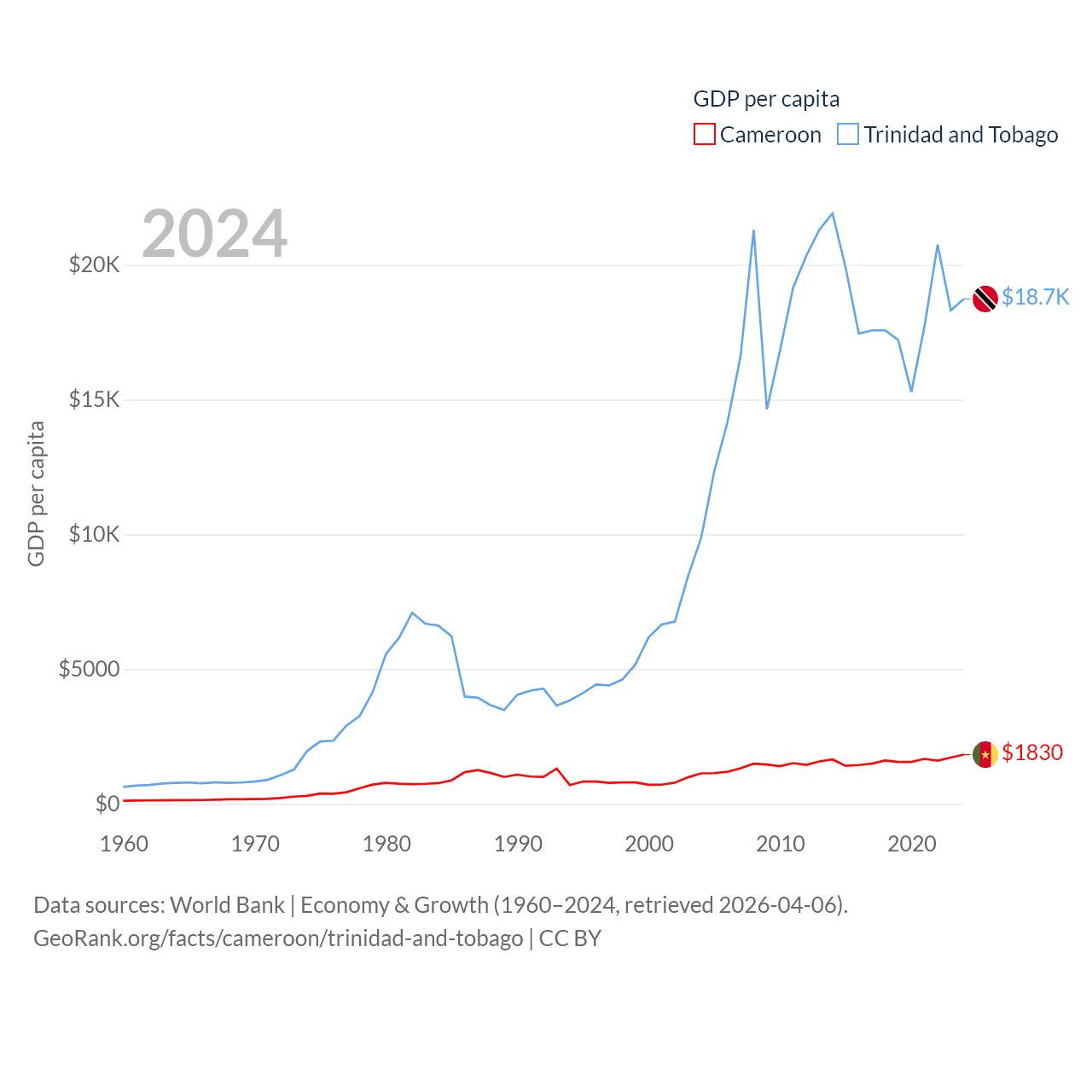 By GDP, Cameroon ranks 91/197 ($53.3B) and Trinidad and Tobago ranks 115/197 ($25.6B). By GDP per capita, Cameroon ranks 158/197 ($1,830), while Trinidad and Tobago ranks 61/197 ($18,733).