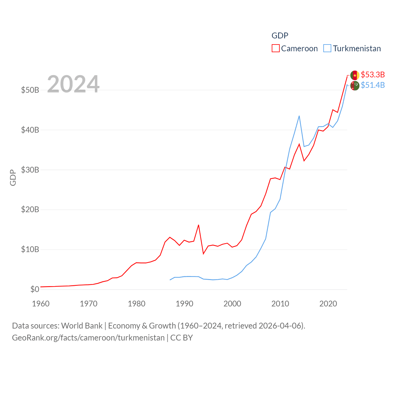 By GDP, Cameroon ranks 91/197 ($53.3B) and Turkmenistan ranks 92/197 ($51.4B). By GDP per capita, Cameroon ranks 158/197 ($1,830), while Turkmenistan ranks 104/197 ($6,857).