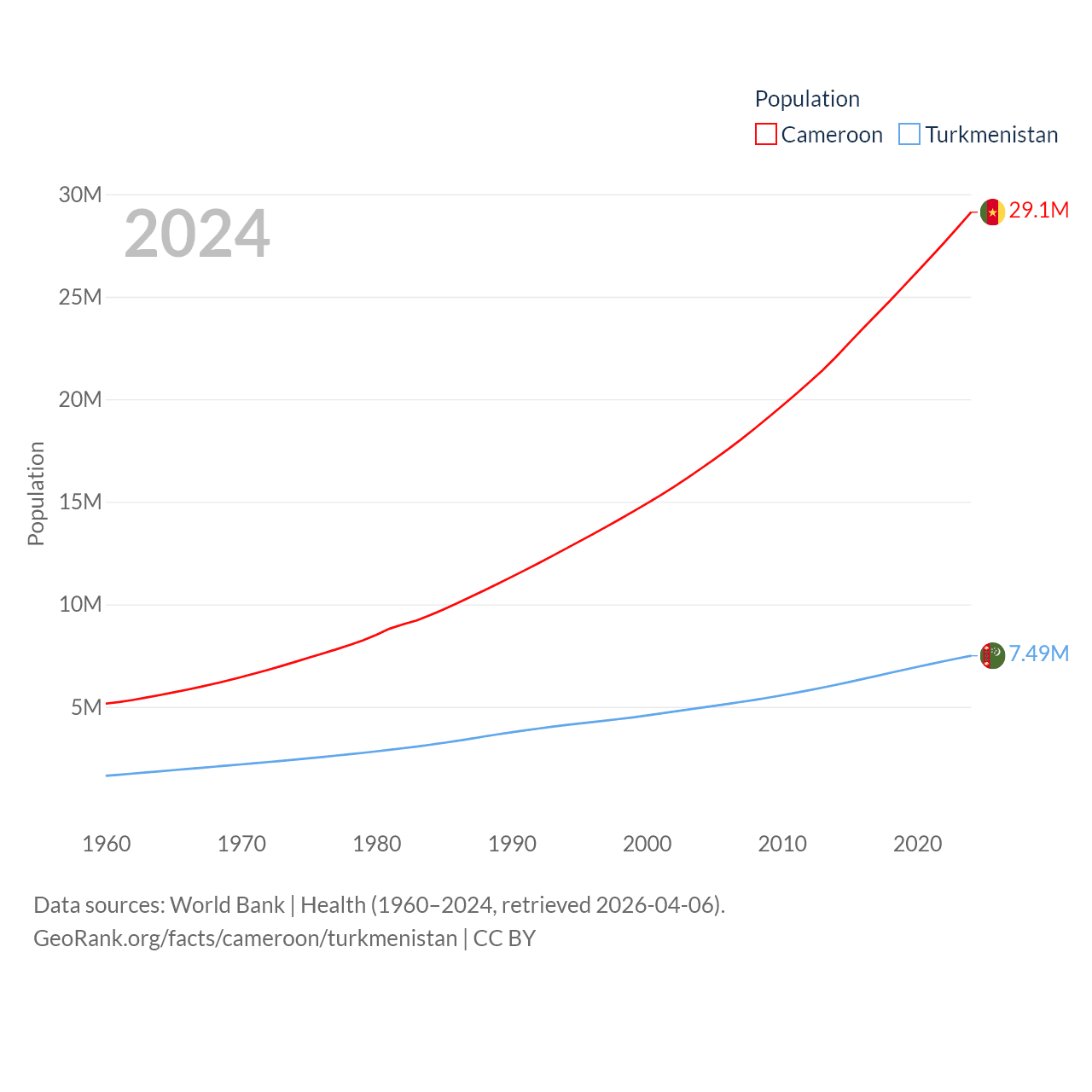 Cameroon has a population of 29.1M (ranked 52/197), compared with 7.49M in Turkmenistan (ranked 104/197). Cameroon's land area is 182,514 sq mi versus 181,441 sq mi for Turkmenistan (ranked 52nd vs. 53rd).
