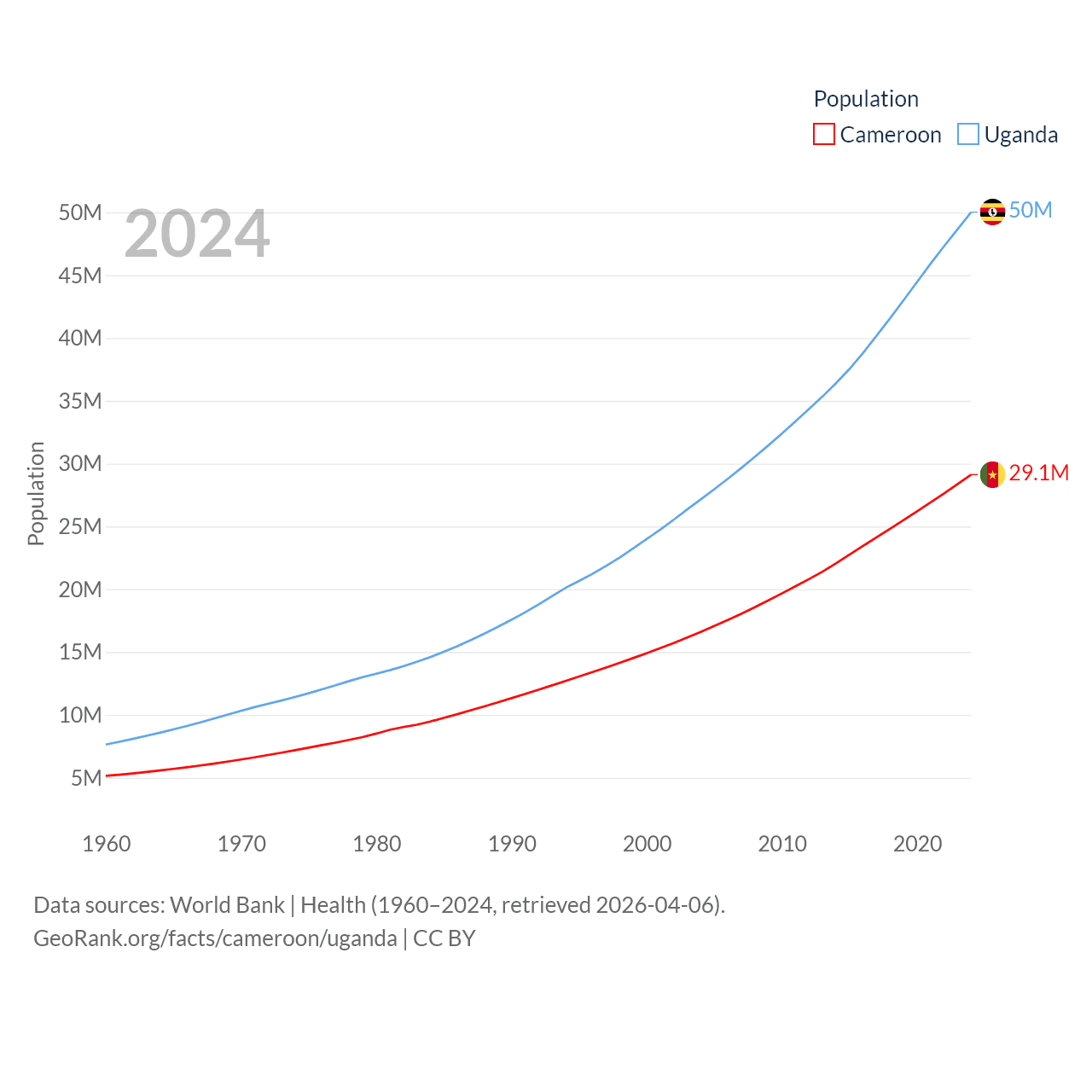 Cameroon has a population of 29.1M (ranked 52/197), compared with 50M in Uganda (ranked 31/197). Cameroon's land area is 182,514 sq mi versus 77,421 sq mi for Uganda (ranked 52nd vs. 84th).