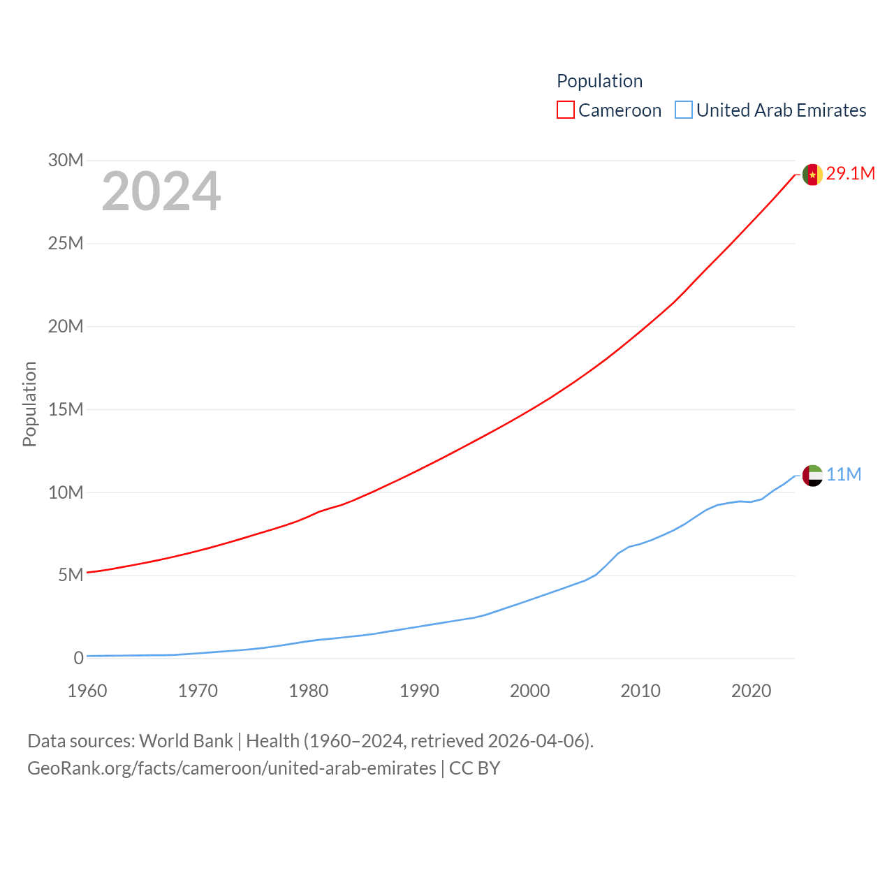 Cameroon has a population of 29.1M (ranked 52/197), compared with 11M in The United Arab Emirates (ranked 86/197). Cameroon's land area is 182,514 sq mi versus 27,421 sq mi for The United Arab Emirates (ranked 52nd vs. 117th).