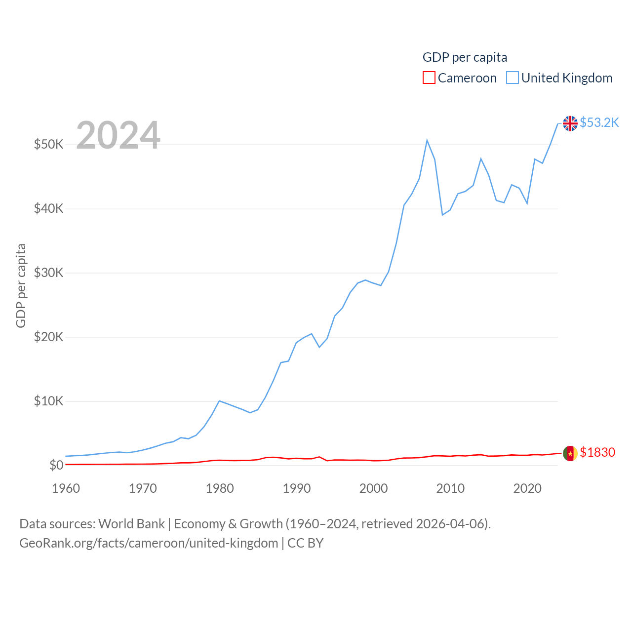By GDP, Cameroon ranks 91/197 ($53.3B) and The United Kingdom ranks 6/197 ($3.69T). By GDP per capita, Cameroon ranks 158/197 ($1,830), while The United Kingdom ranks 22/197 ($53,246).