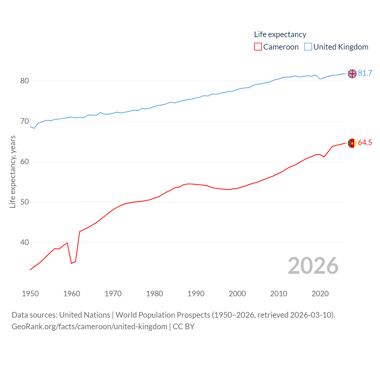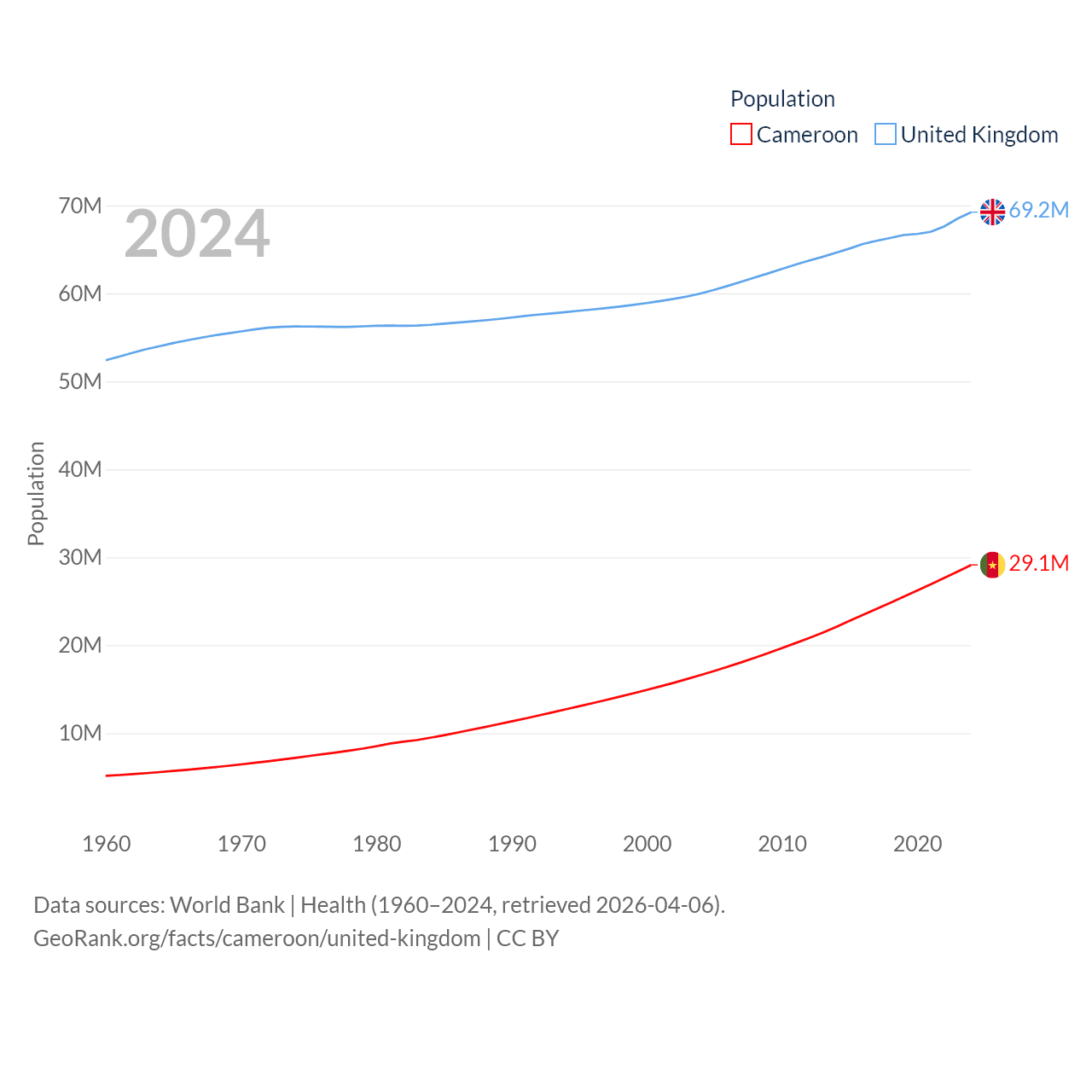 Cameroon has a population of 29.1M (ranked 52/197), compared with 69.2M in The United Kingdom (ranked 21/197). Cameroon's land area is 182,514 sq mi versus 93,410 sq mi for The United Kingdom (ranked 52nd vs. 78th).