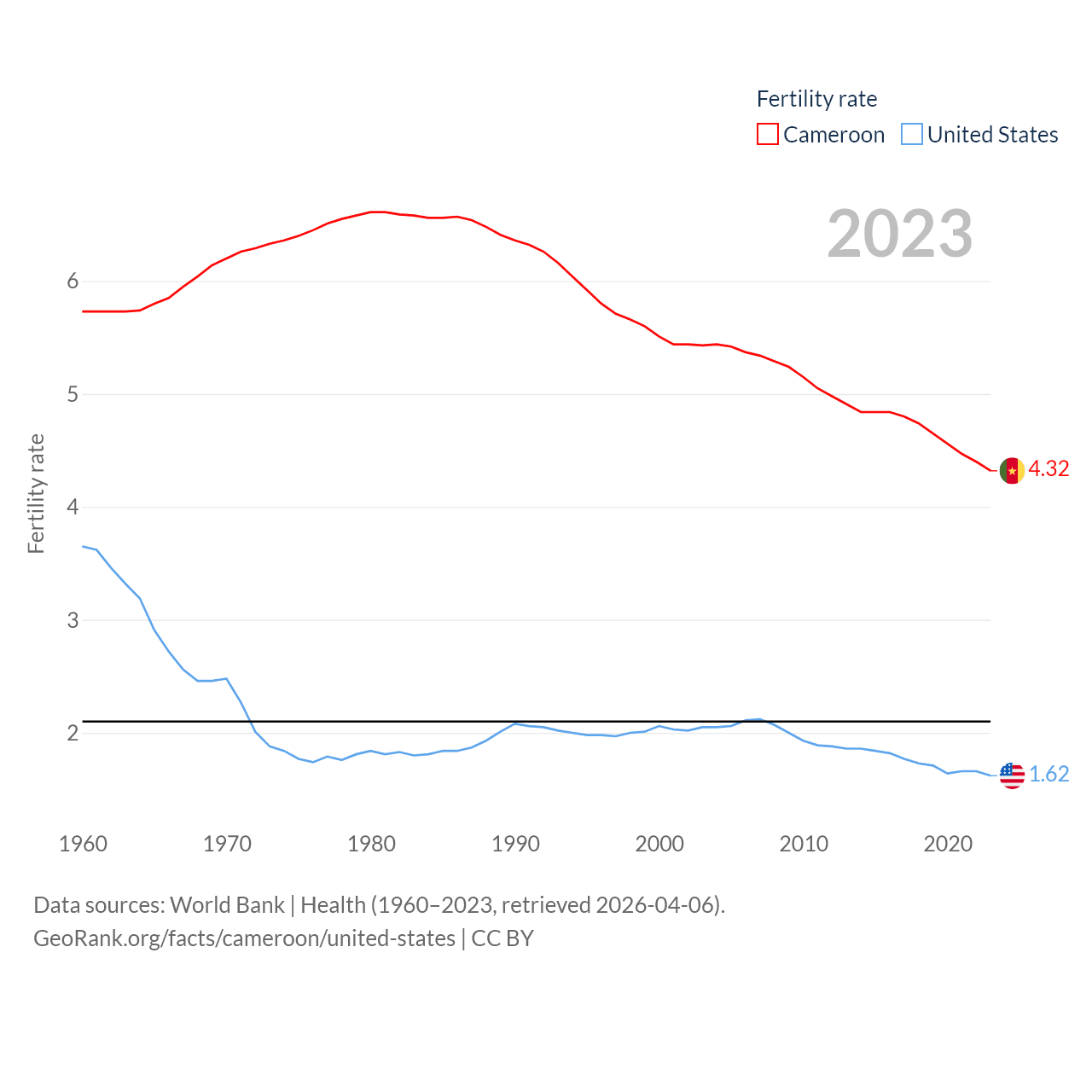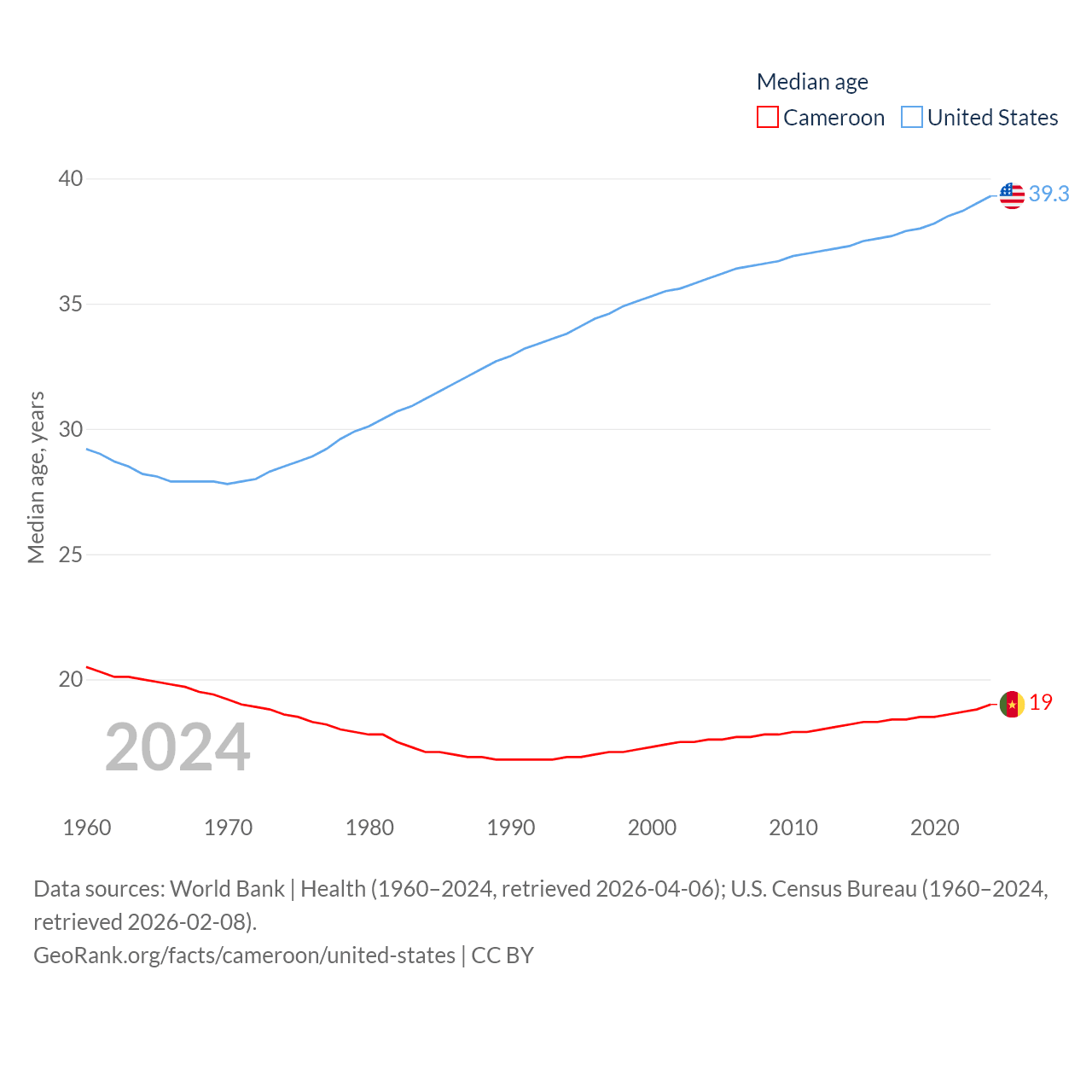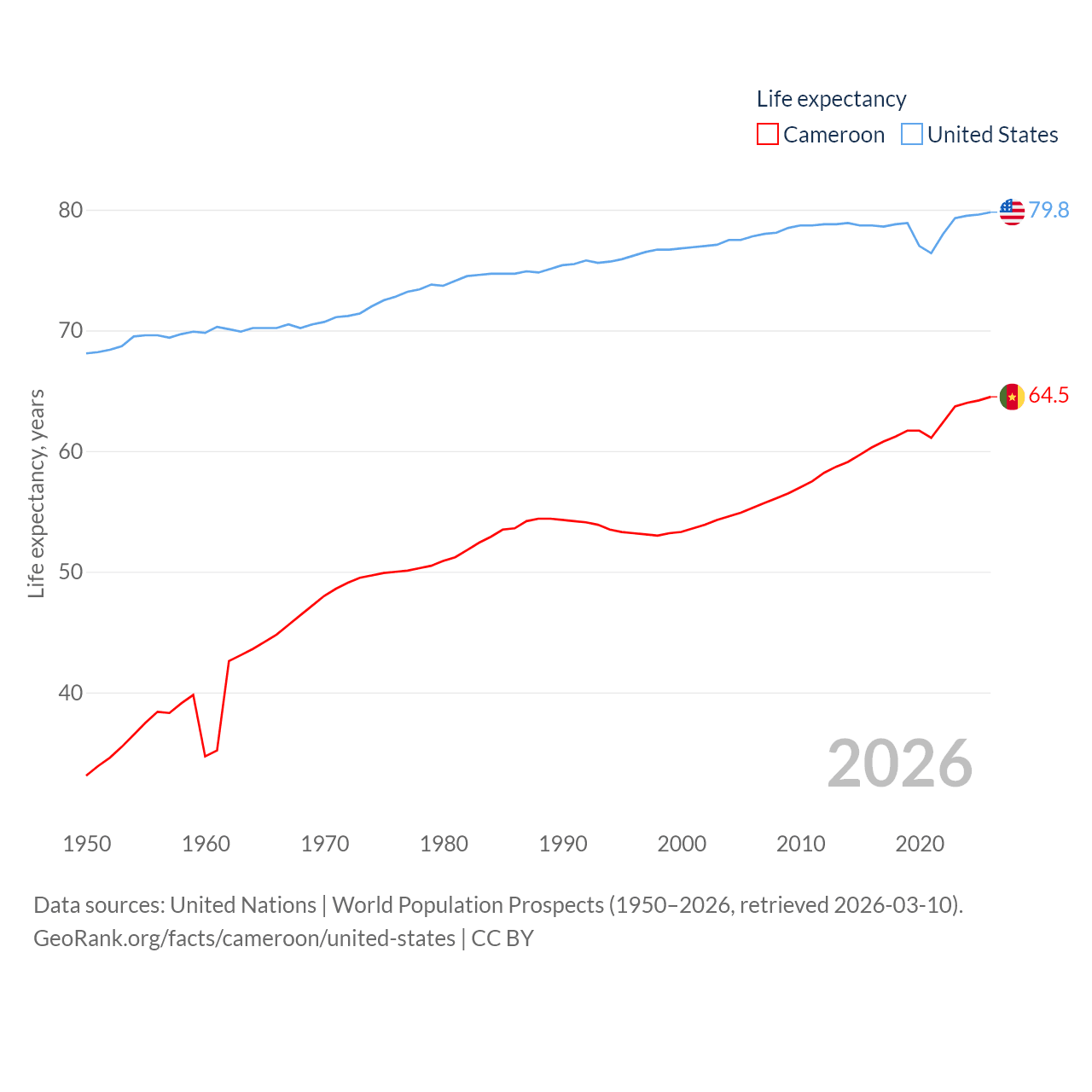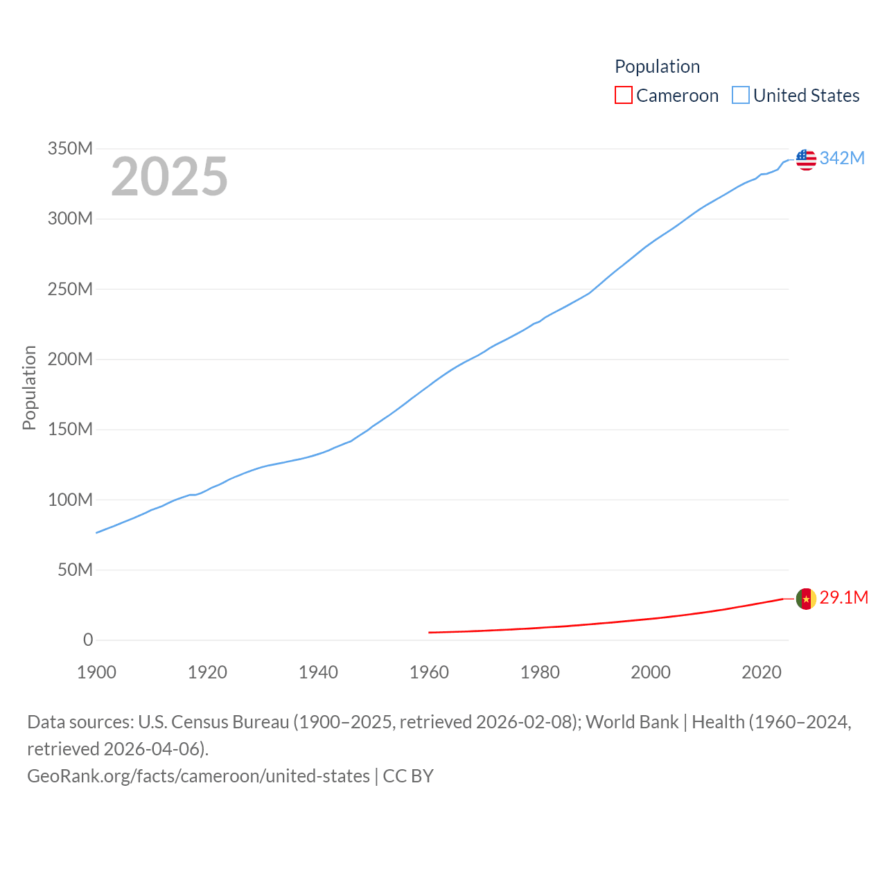 Cameroon has a population of 29.1M (ranked 52/197), compared with 342M in The United States (ranked 3/197). Cameroon's land area is 182,514 sq mi versus 3,531,839 sq mi for The United States (ranked 52nd vs. 3rd).