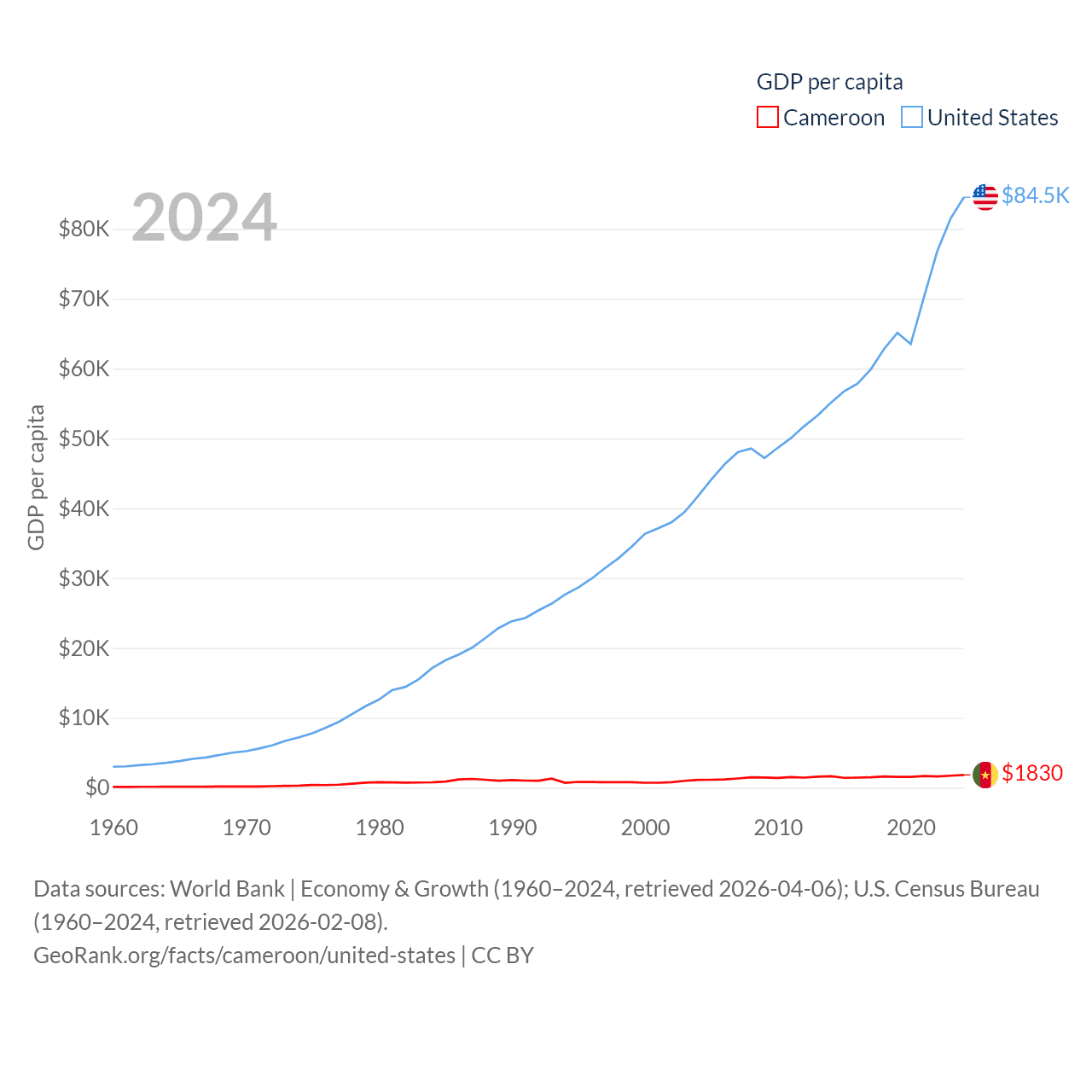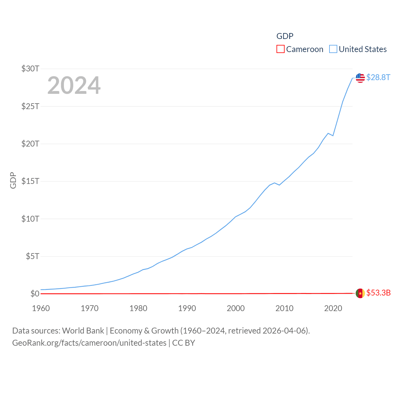 By GDP, Cameroon ranks 91/197 ($53.3B) and The United States ranks 1/197 ($28.8T). By GDP per capita, Cameroon ranks 158/197 ($1,830), while The United States ranks 10/197 ($84,534).