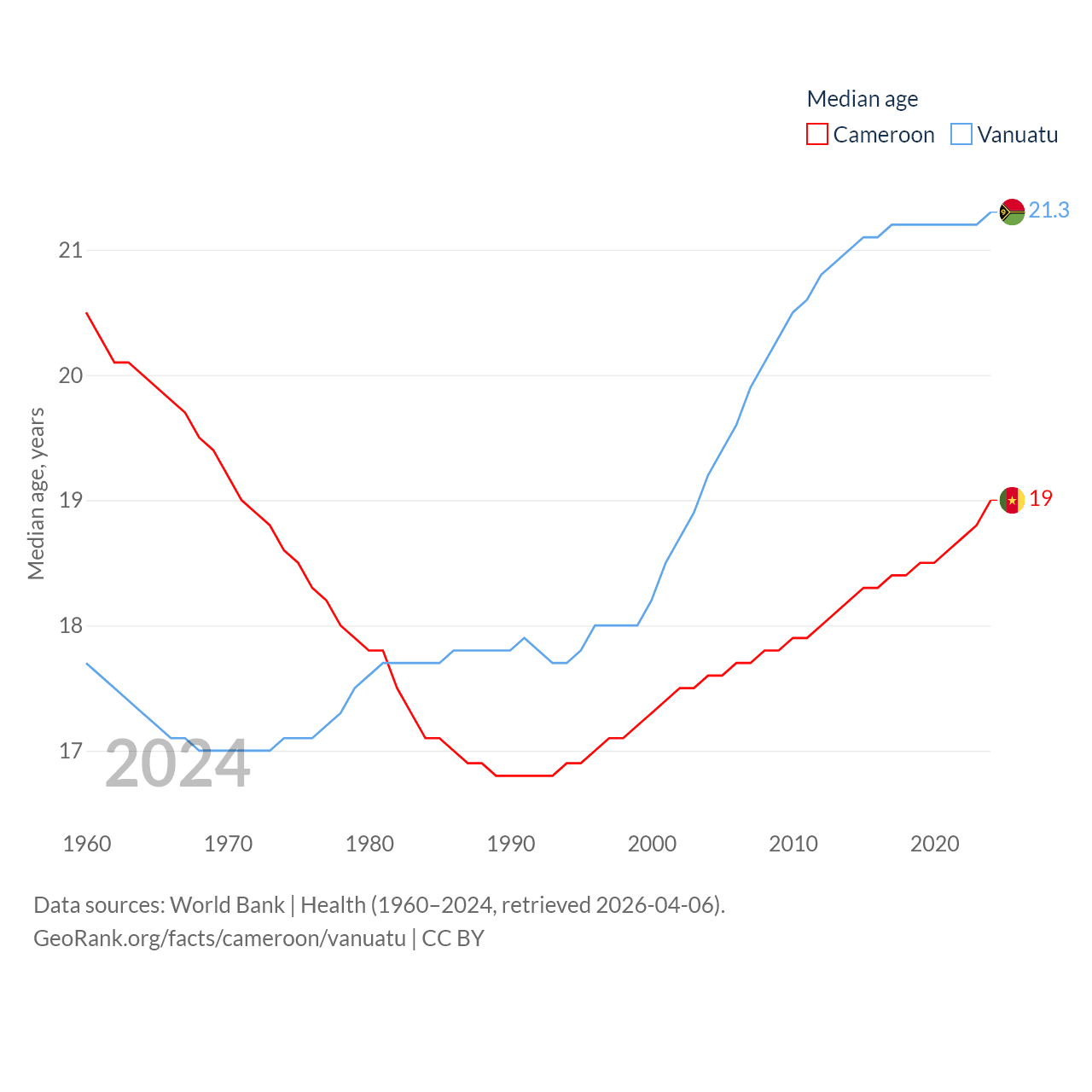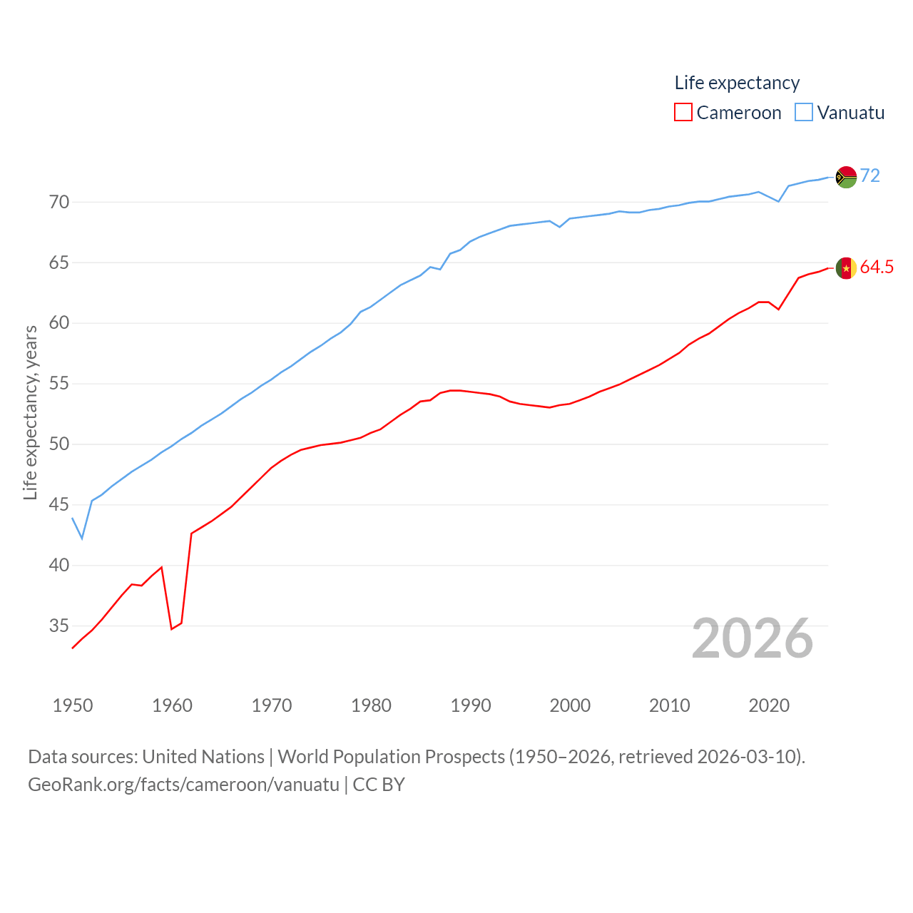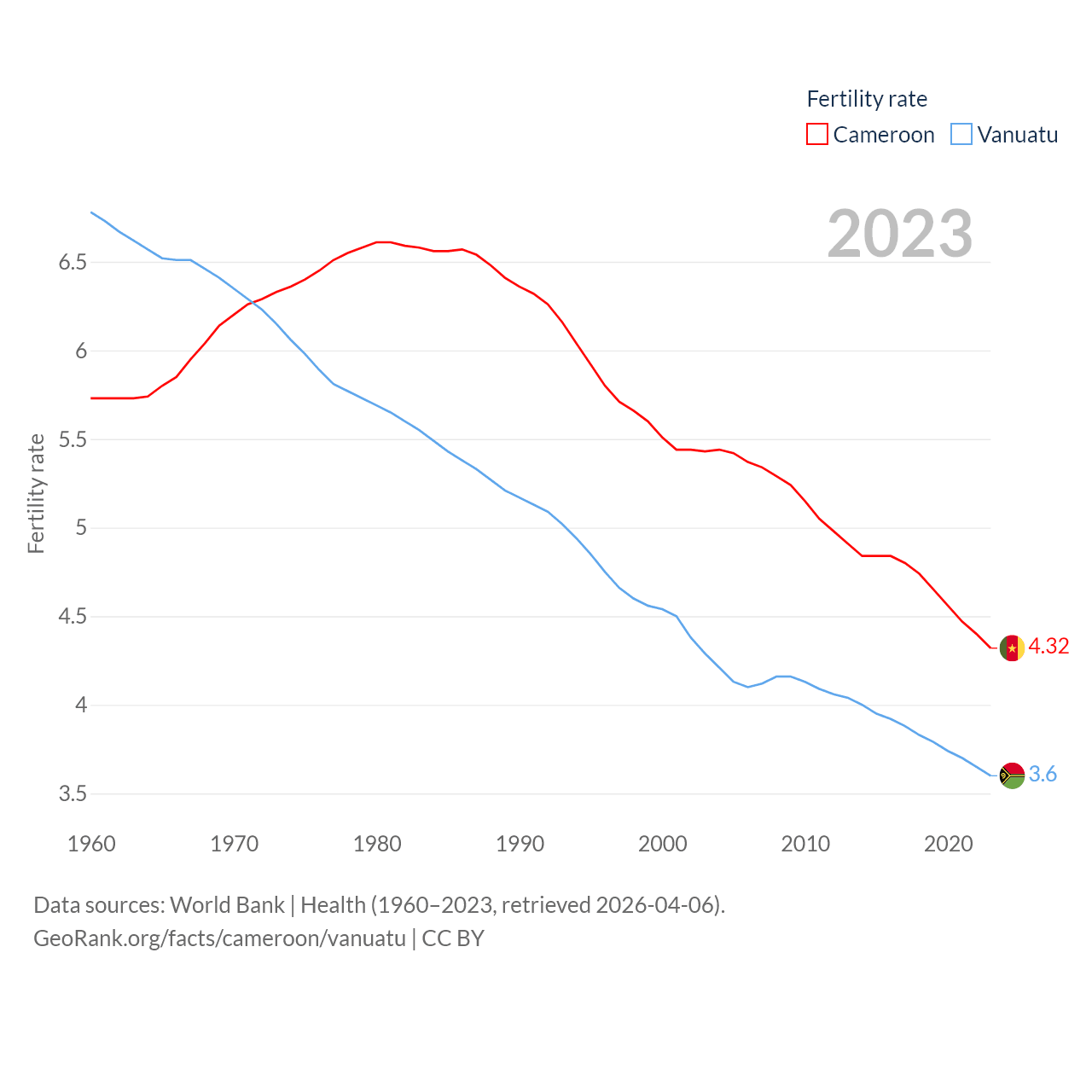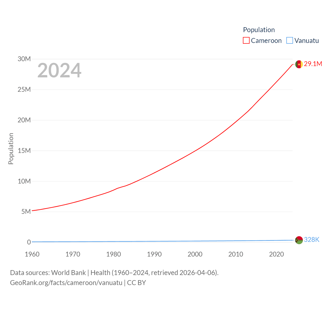 Cameroon has a population of 29.1M (ranked 52/197), compared with 328K in Vanuatu (ranked 174/197). Cameroon's land area is 182,514 sq mi versus 4,707 sq mi for Vanuatu (ranked 52nd vs. 157th).