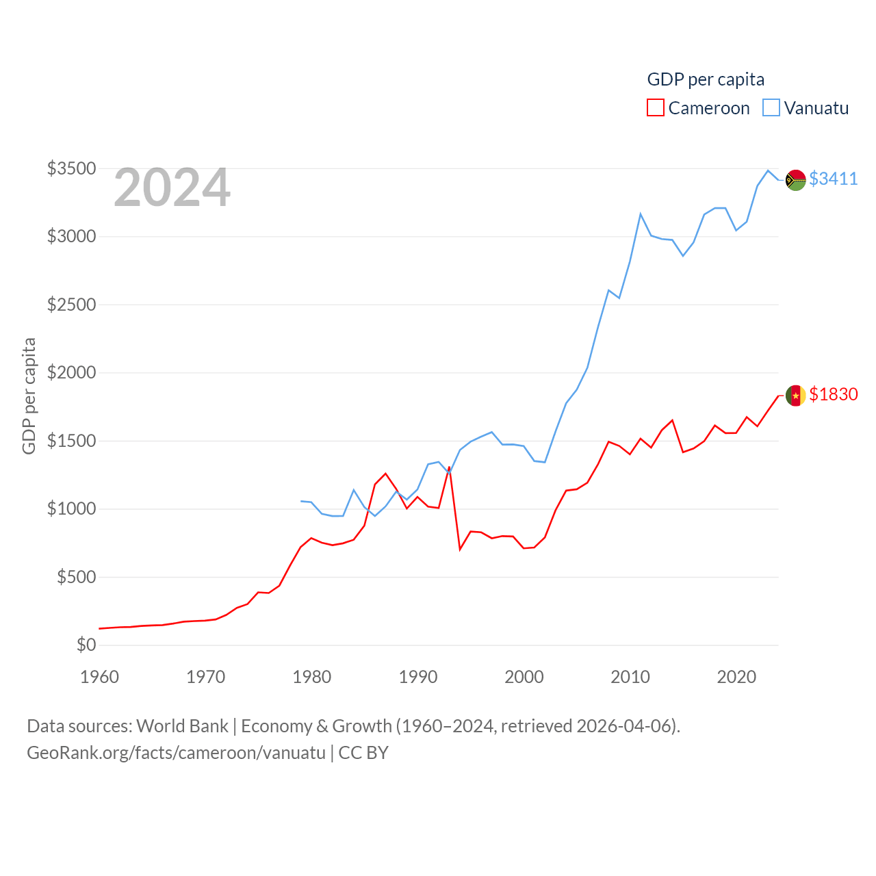 By GDP, Cameroon ranks 91/197 ($53.3B) and Vanuatu ranks 188/197 ($1.12B). By GDP per capita, Cameroon ranks 158/197 ($1,830), while Vanuatu ranks 137/197 ($3,411).