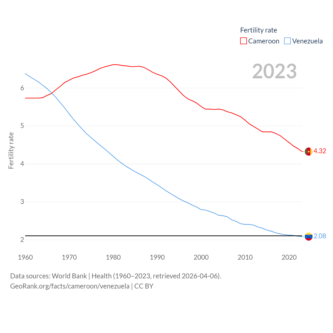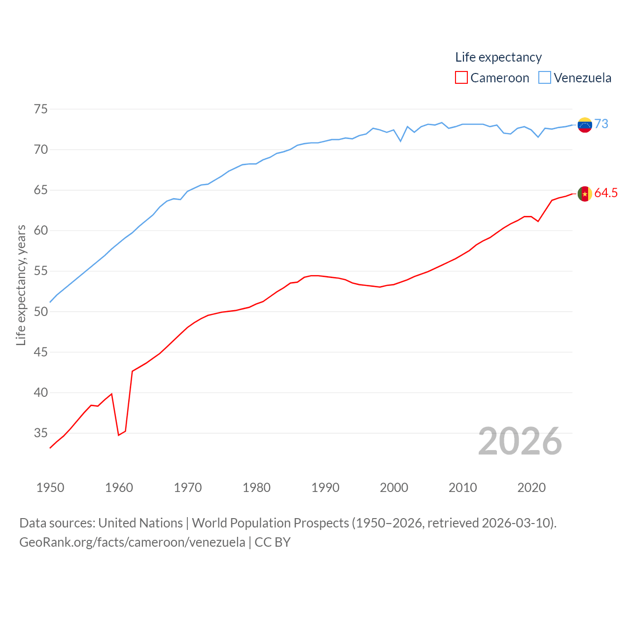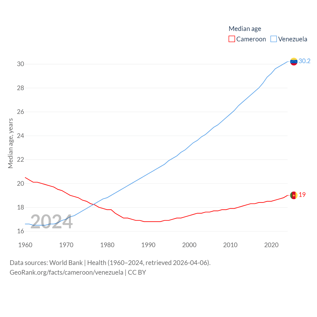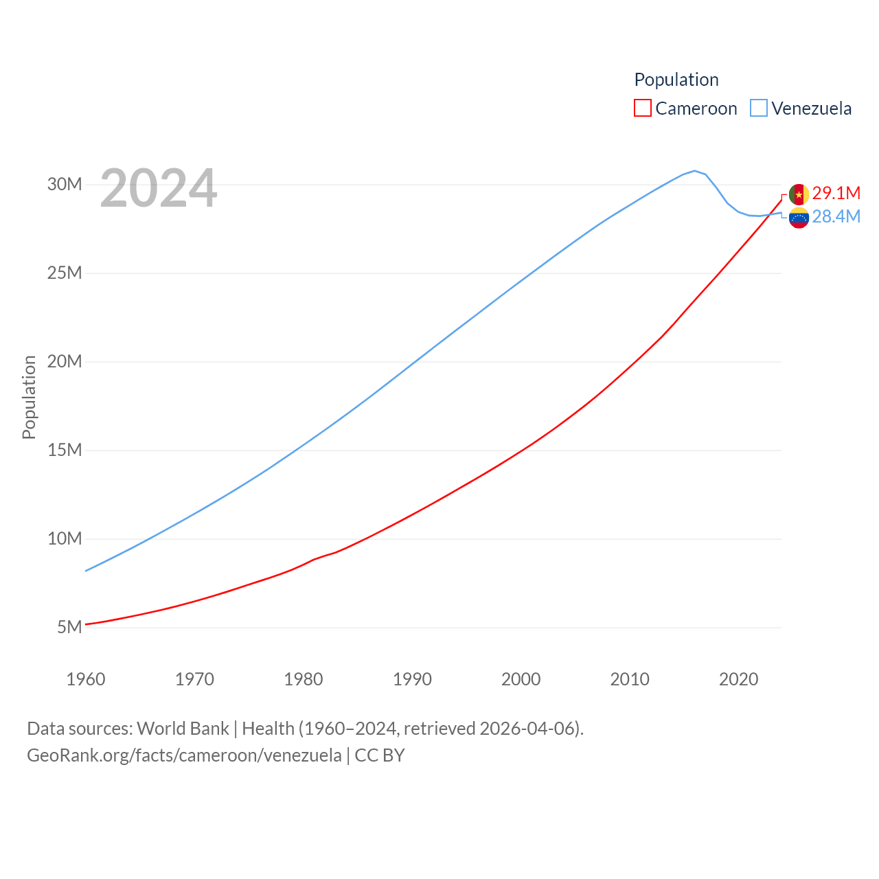 Cameroon has a population of 29.1M (ranked 52/197), compared with 28.4M in Venezuela (ranked 53/197). Cameroon's land area is 182,514 sq mi versus 340,561 sq mi for Venezuela (ranked 52nd vs. 32nd).
