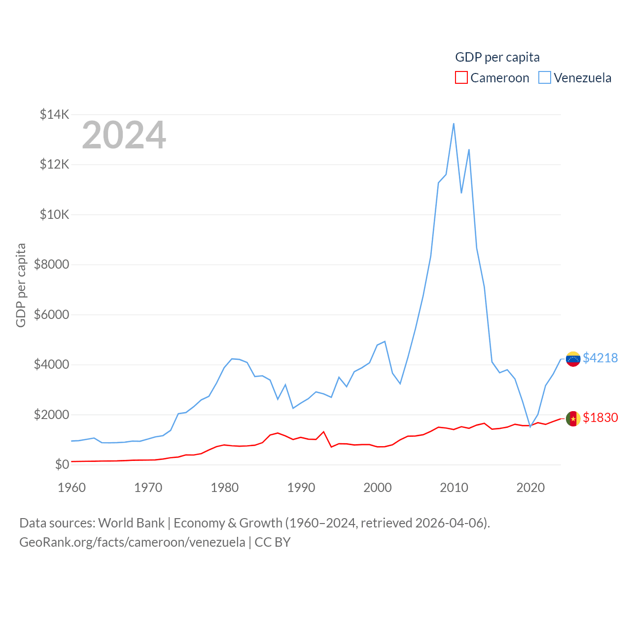 By GDP, Cameroon ranks 91/197 ($53.3B) and Venezuela ranks 65/197 ($120B). By GDP per capita, Cameroon ranks 158/197 ($1,830), while Venezuela ranks 128/197 ($4,218).