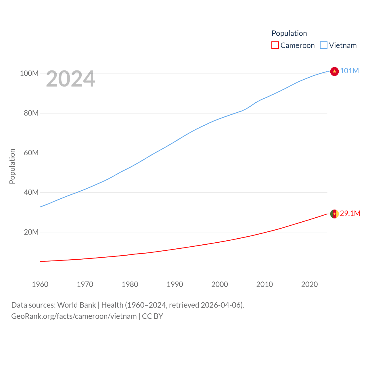 Cameroon has a population of 29.1M (ranked 52/197), compared with 101M in Vietnam (ranked 16/197). Cameroon's land area is 182,514 sq mi versus 121,016 sq mi for Vietnam (ranked 52nd vs. 67th).