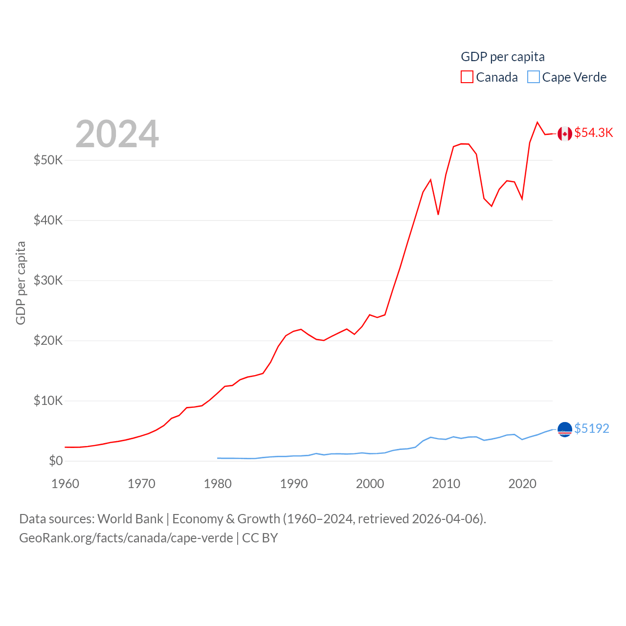 By GDP, Canada ranks 9/197 ($2.24T) and Cape Verde ranks 172/197 ($2.73B). By GDP per capita, Canada ranks 20/197 ($54,340), while Cape Verde ranks 118/197 ($5,192).
