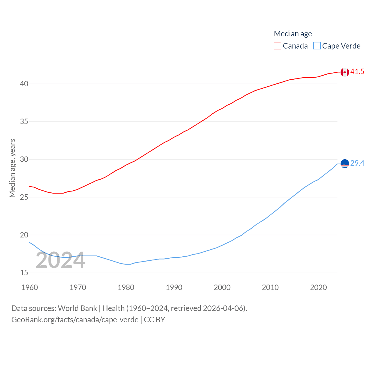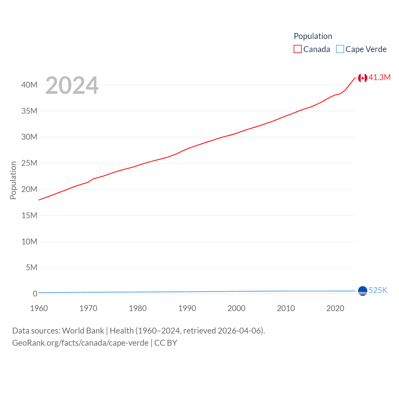 Canada has a population of 41.3M (ranked 37/197), compared with 525K in Cape Verde (ranked 169/197). Canada's land area is 3,393,336 sq mi versus 1,556 sq mi for Cape Verde (ranked 4th vs. 167th).