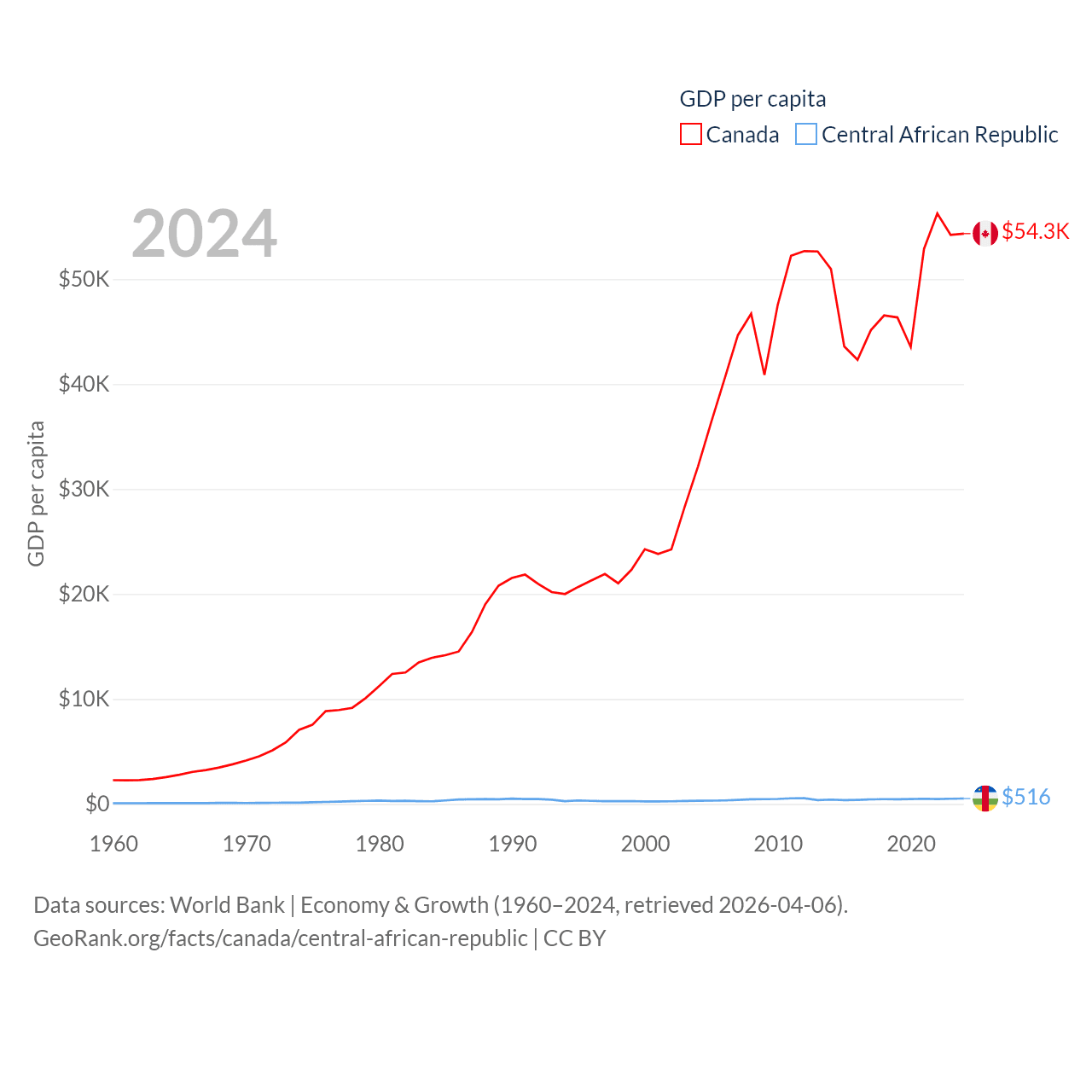 By GDP, Canada ranks 9/197 ($2.24T) and The Central African Republic ranks 171/197 ($2.75B). By GDP per capita, Canada ranks 20/197 ($54,340), while The Central African Republic ranks 195/197 ($516).