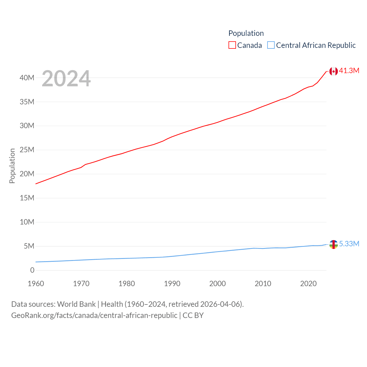 Canada has a population of 41.3M (ranked 37/197), compared with 5.33M in The Central African Republic (ranked 121/197). Canada's land area is 3,393,336 sq mi versus 240,534 sq mi for The Central African Republic (ranked 4th vs. 43rd).
