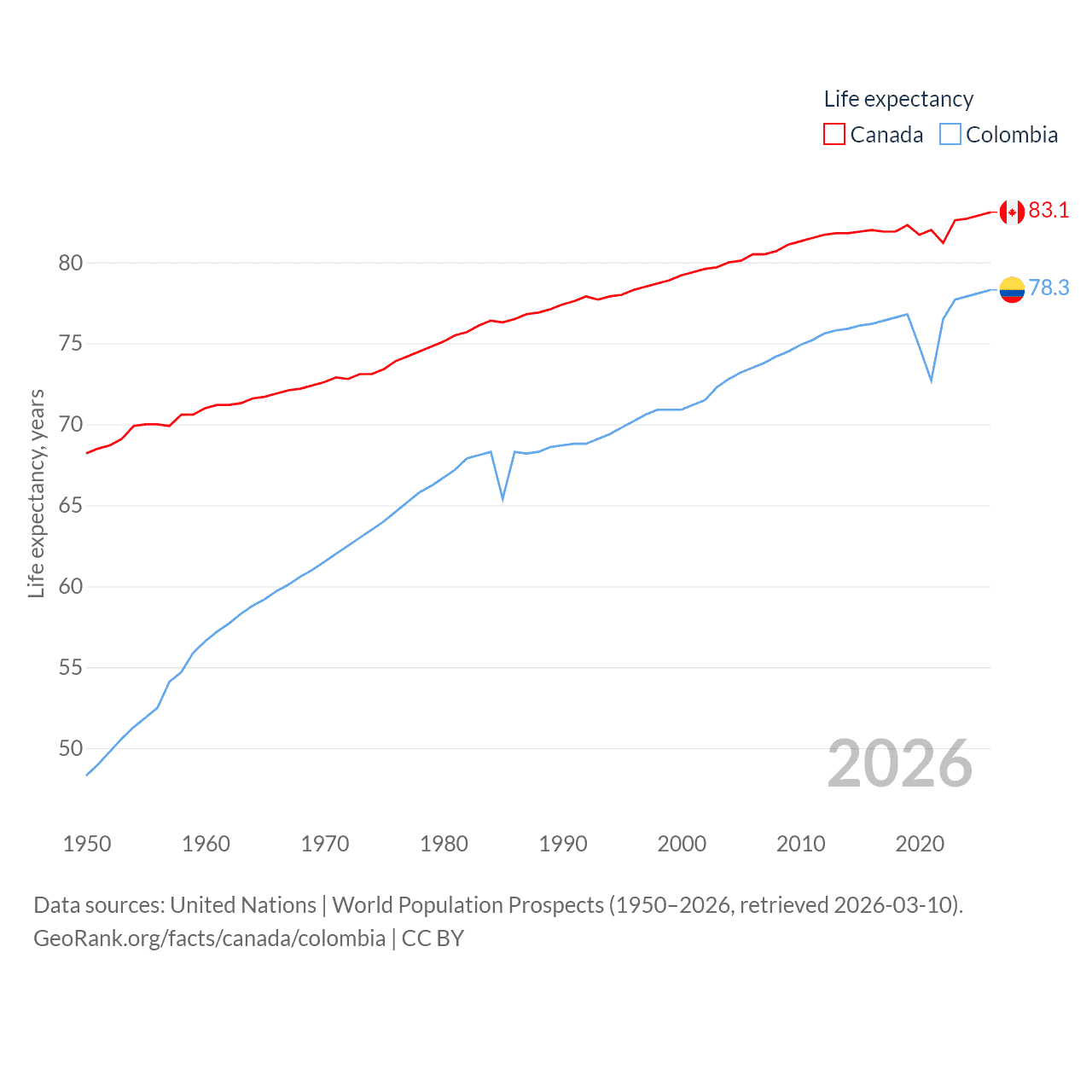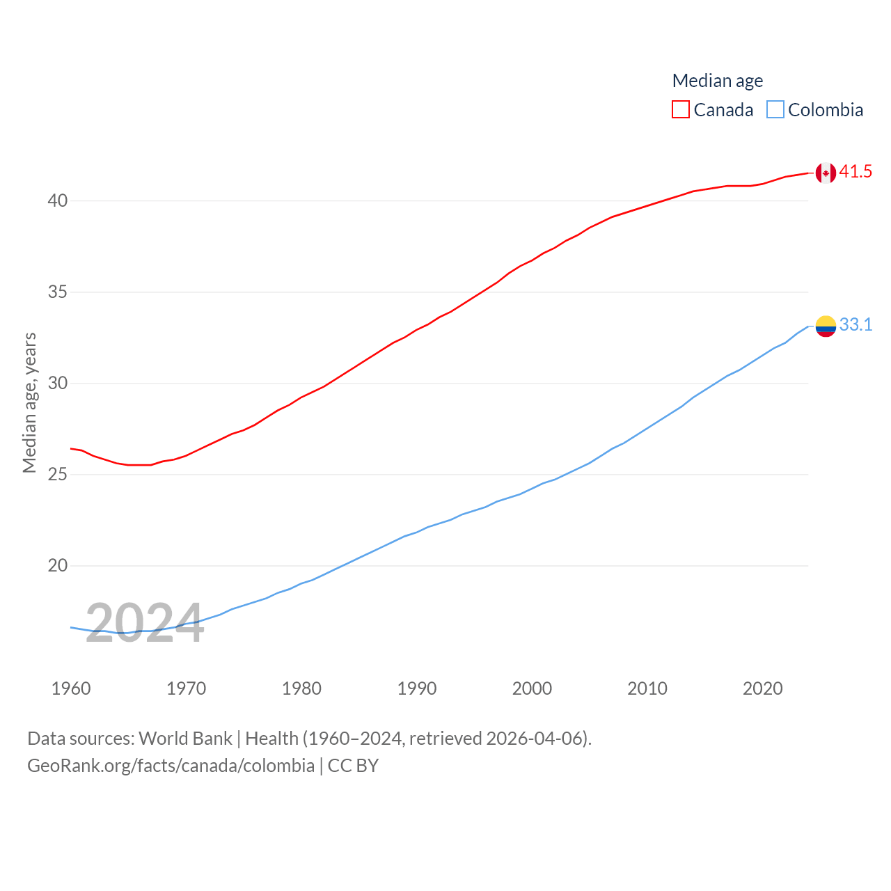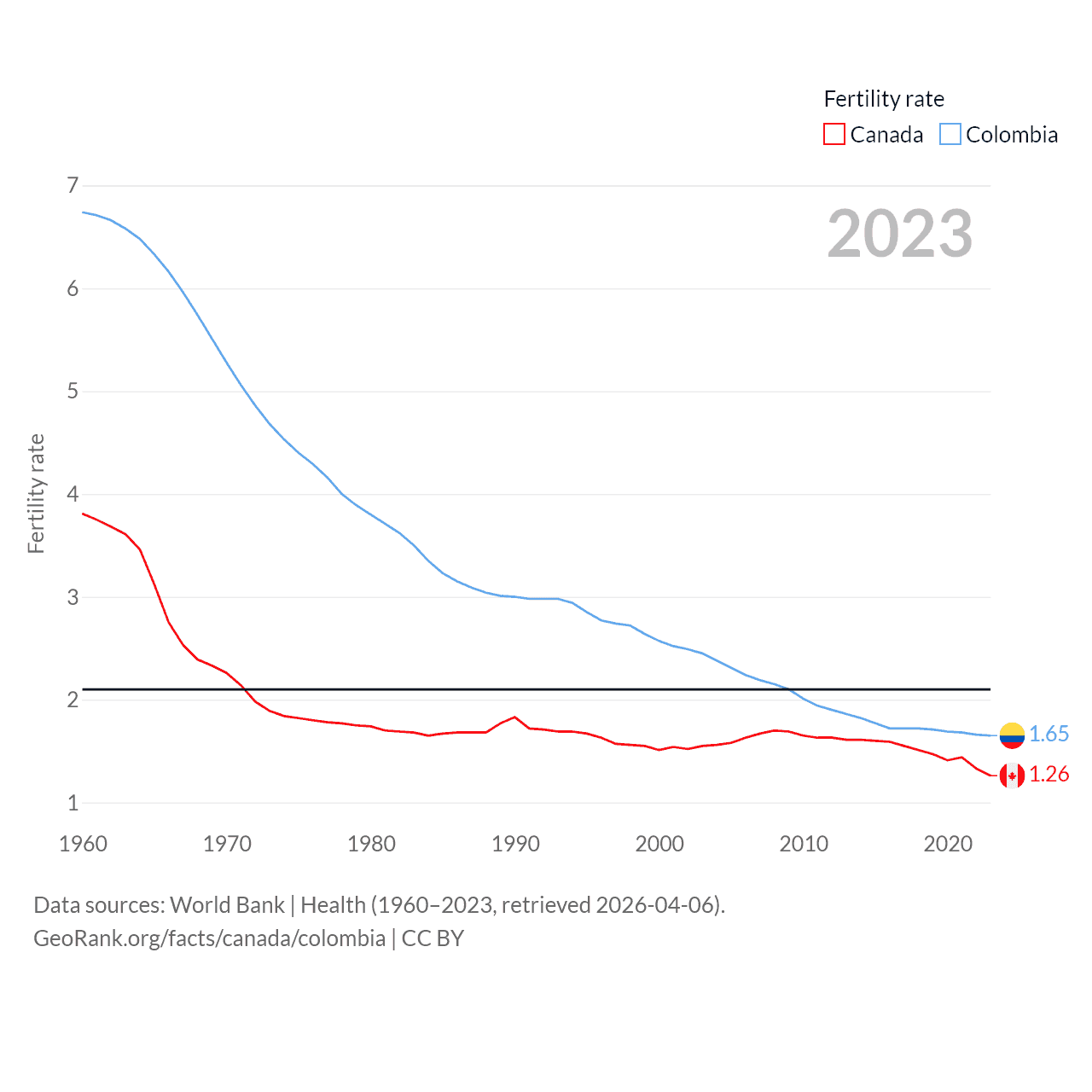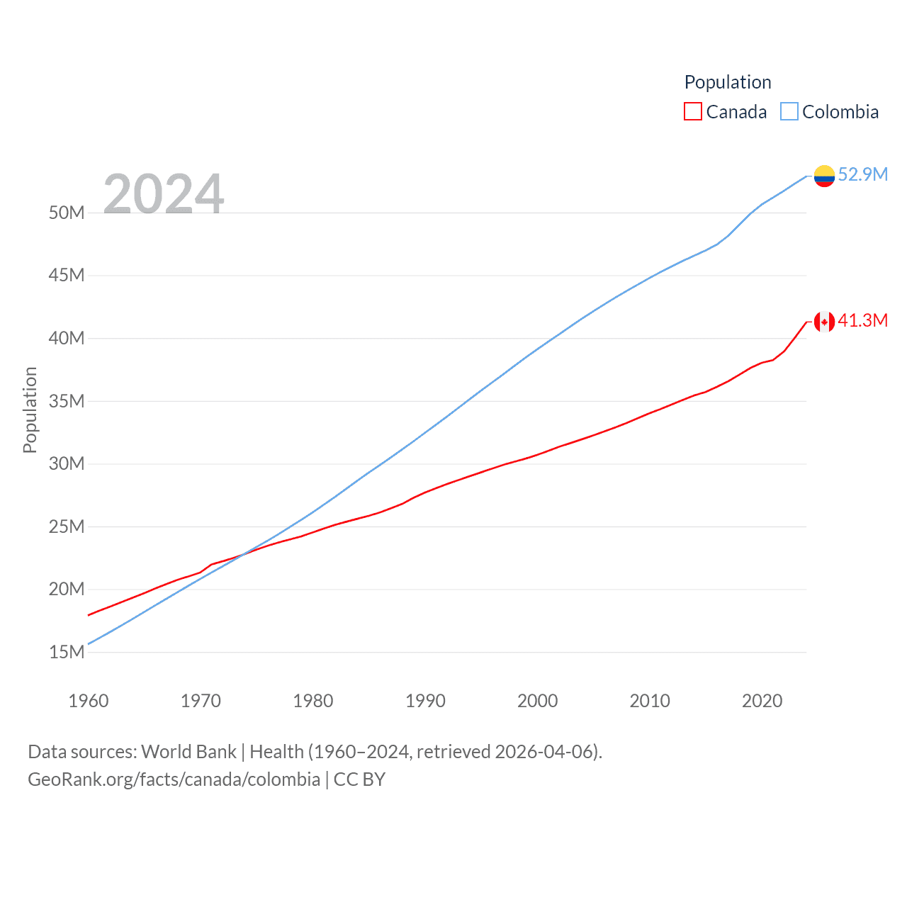 Canada has a population of 41.3M (ranked 37/197), compared with 52.9M in Colombia (ranked 28/197). Canada's land area is 3,393,336 sq mi versus 428,380 sq mi for Colombia (ranked 4th vs. 26th).