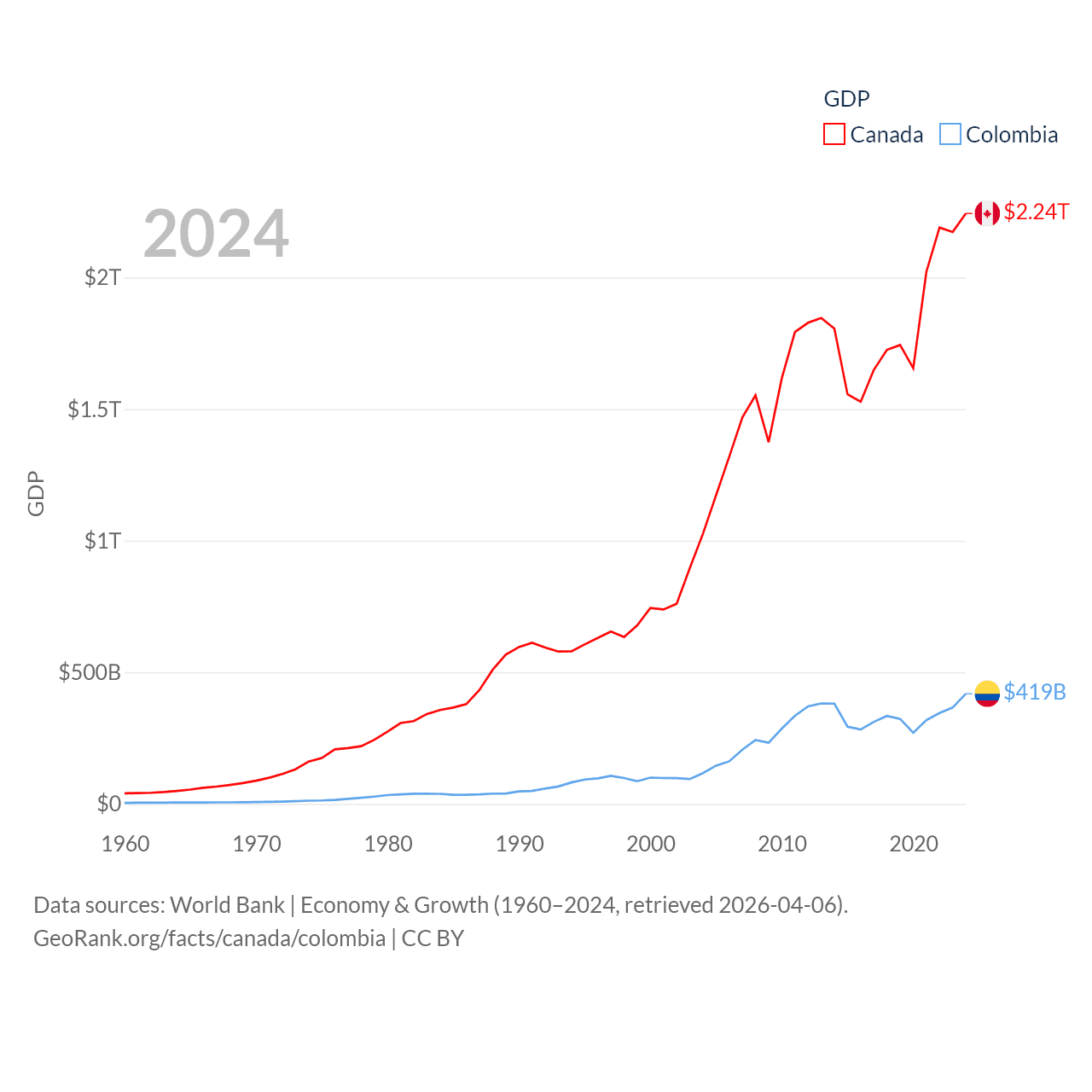 By GDP, Canada ranks 9/197 ($2.24T) and Colombia ranks 39/197 ($419B). By GDP per capita, Canada ranks 20/197 ($54,340), while Colombia ranks 94/197 ($7,919).