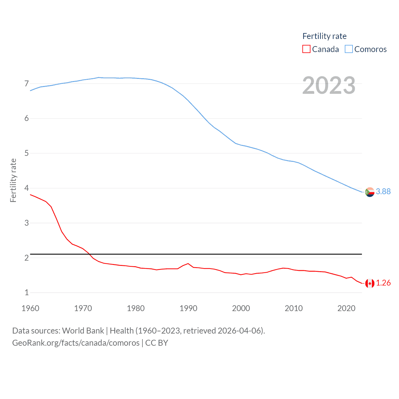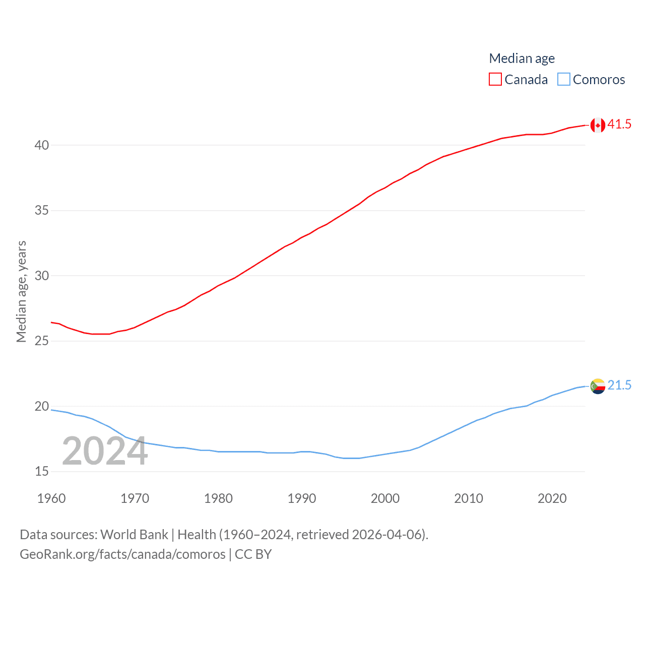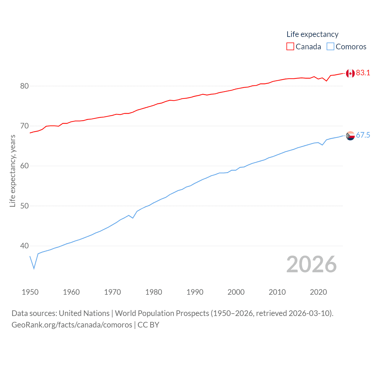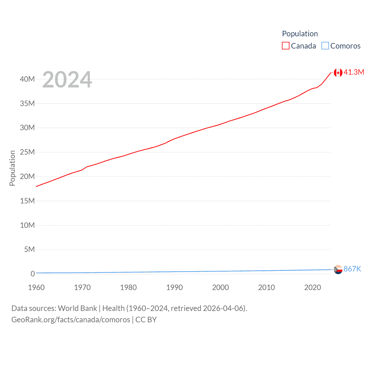 Canada has a population of 41.3M (ranked 37/197), compared with 867K in Comoros (ranked 160/197). Canada's land area is 3,393,336 sq mi versus 719 sq mi for Comoros (ranked 4th vs. 171st).