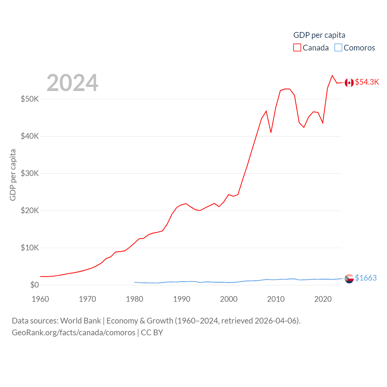 By GDP, Canada ranks 9/197 ($2.24T) and Comoros ranks 183/197 ($1.44B). By GDP per capita, Canada ranks 20/197 ($54,340), while Comoros ranks 161/197 ($1,663).