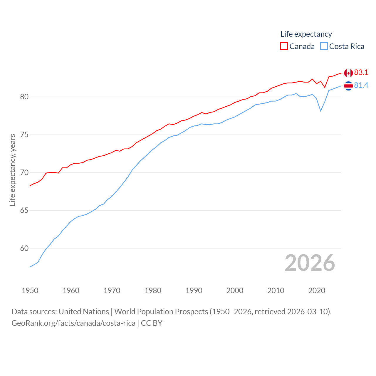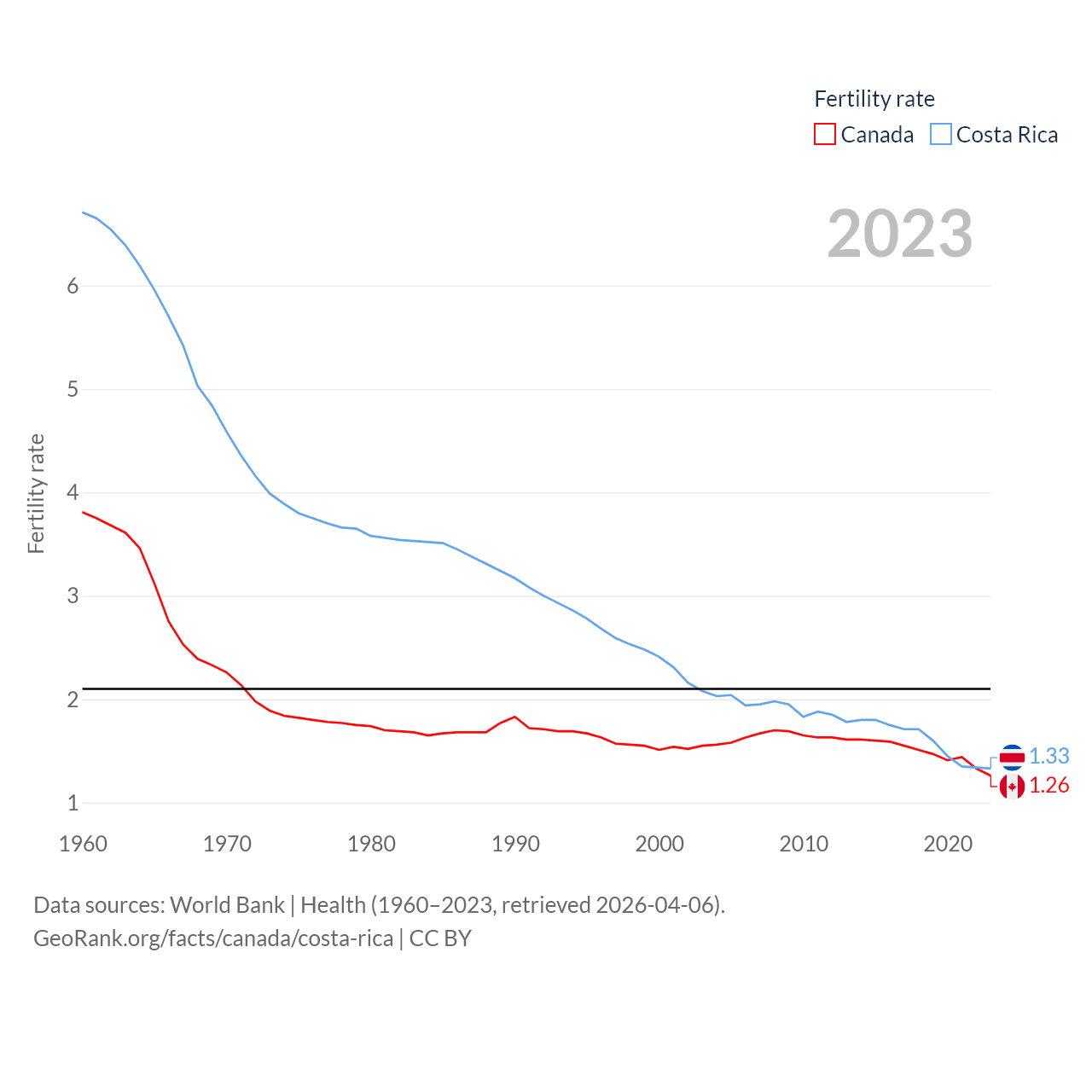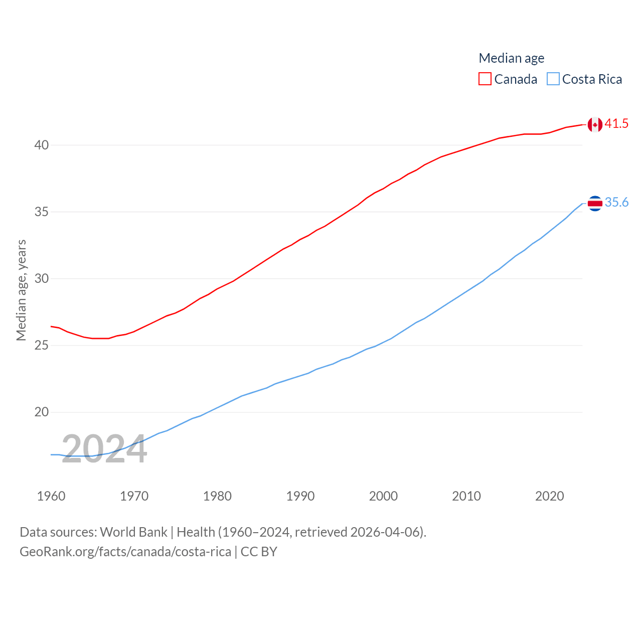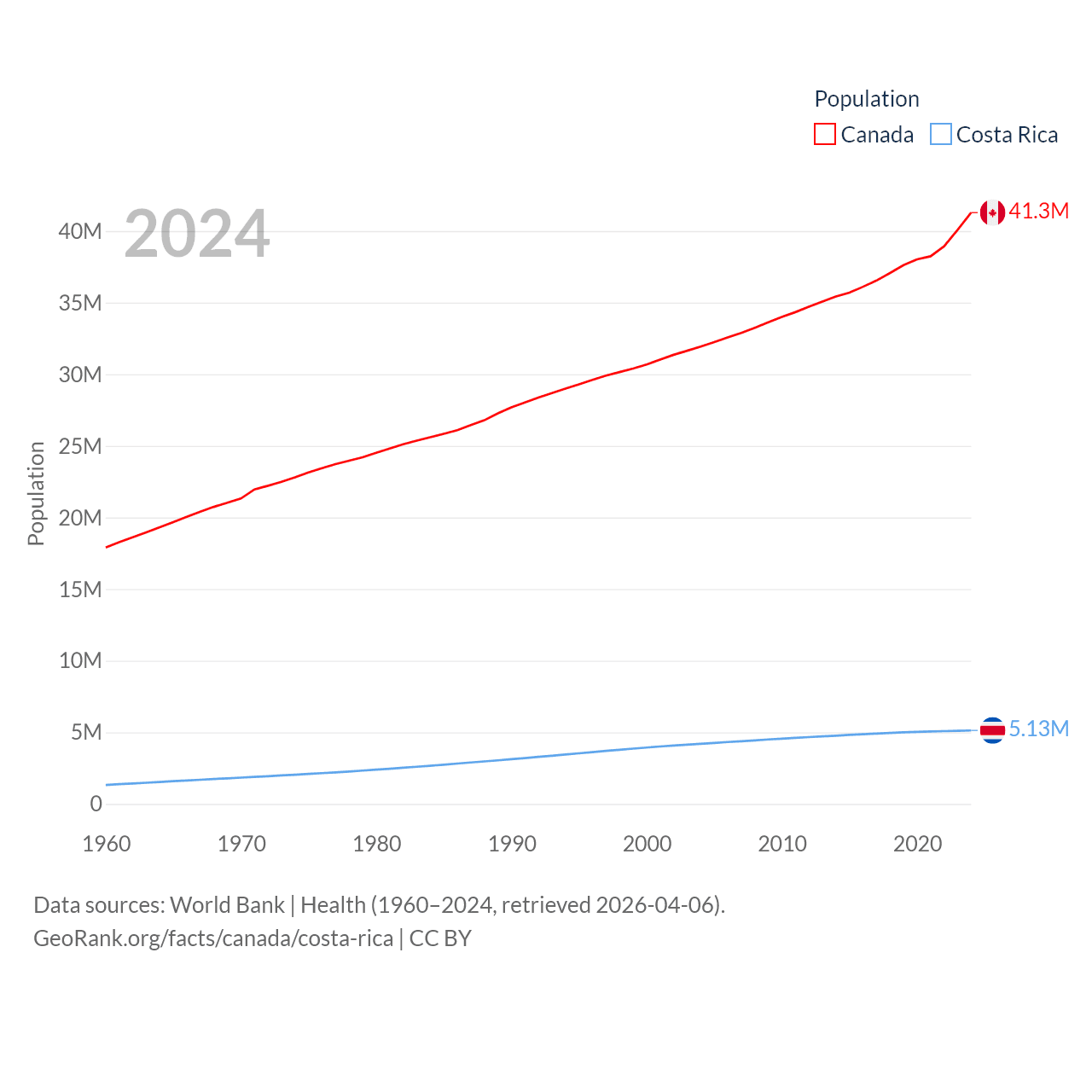 Canada has a population of 41.3M (ranked 37/197), compared with 5.13M in Costa Rica (ranked 126/197). Canada's land area is 3,393,336 sq mi versus 19,714 sq mi for Costa Rica (ranked 4th vs. 126th).