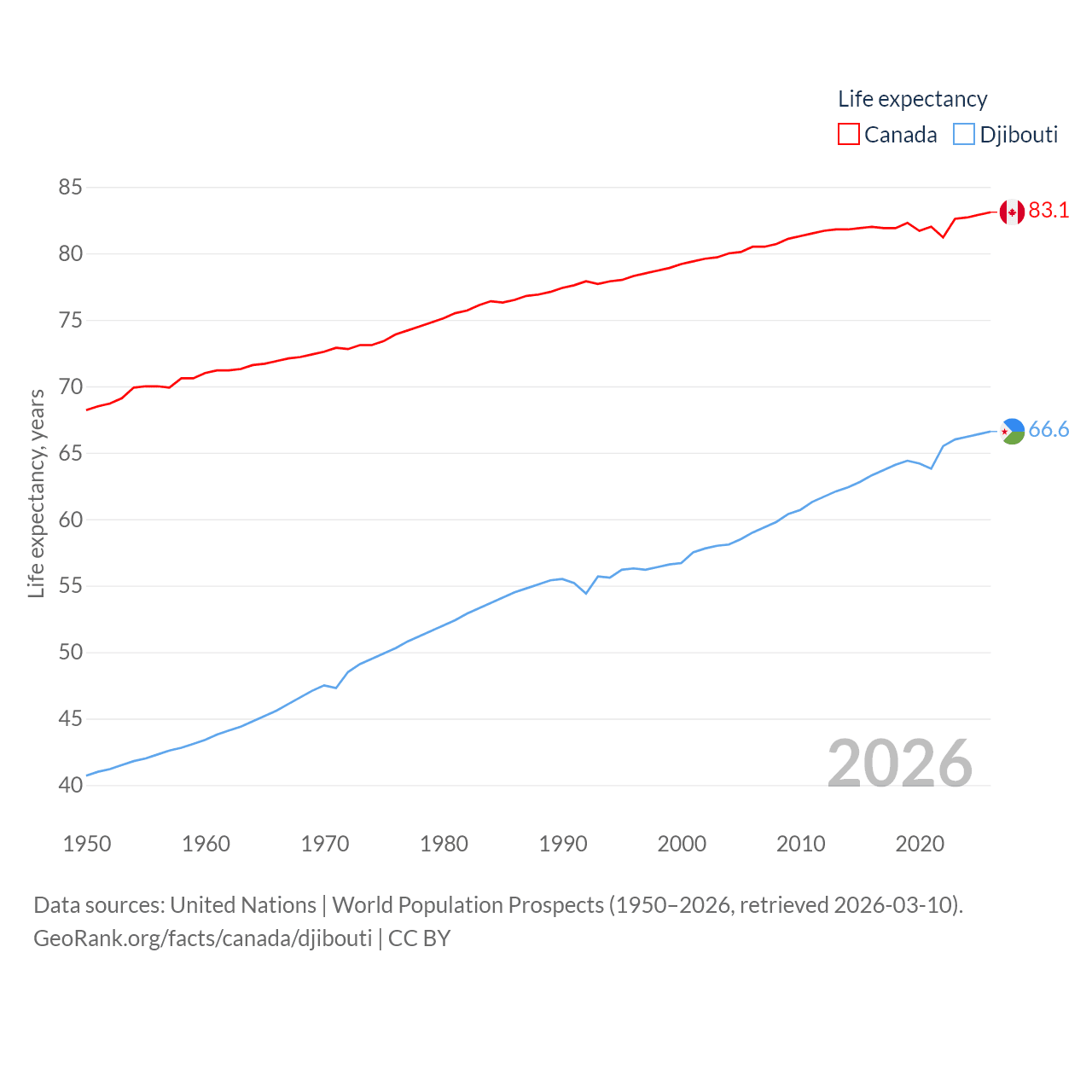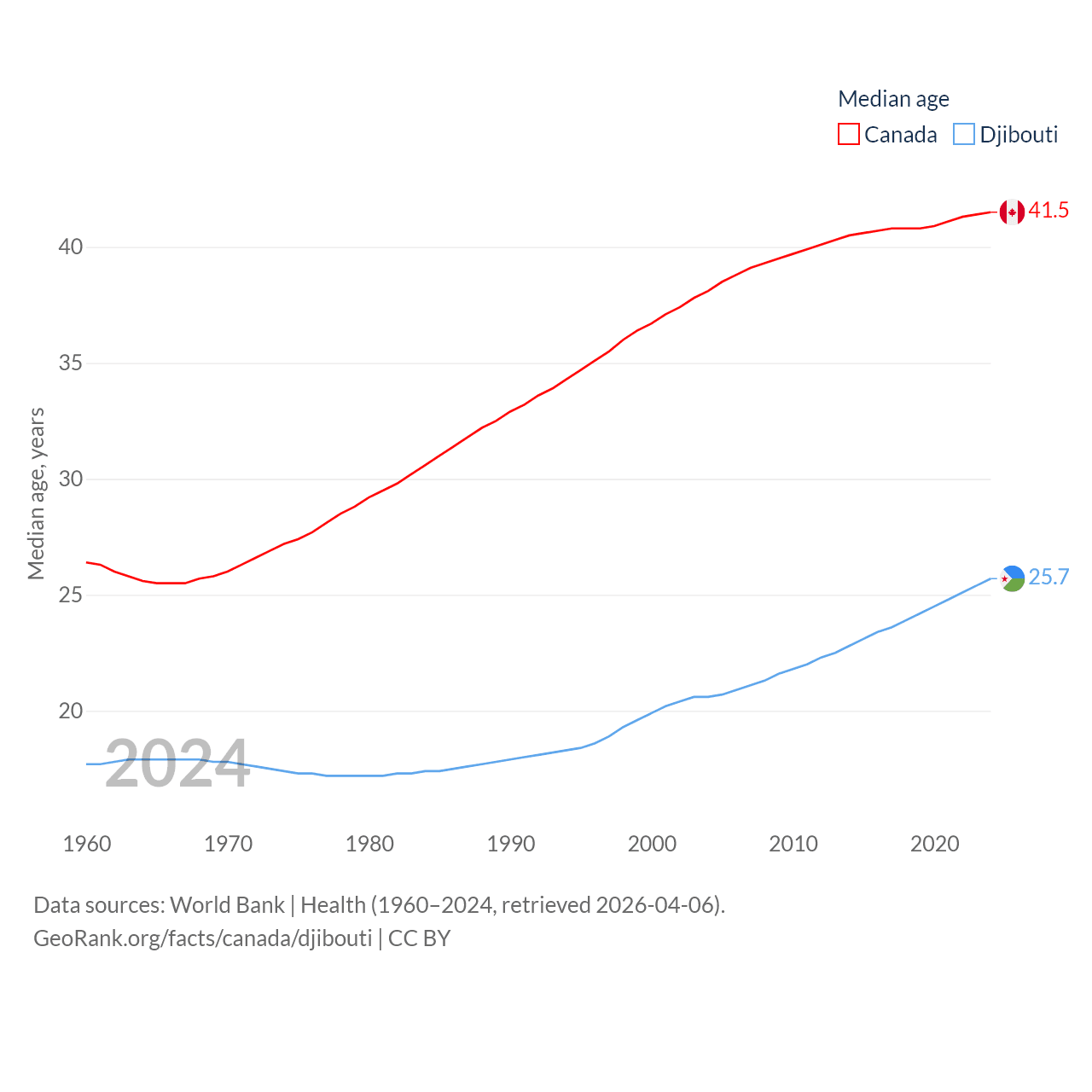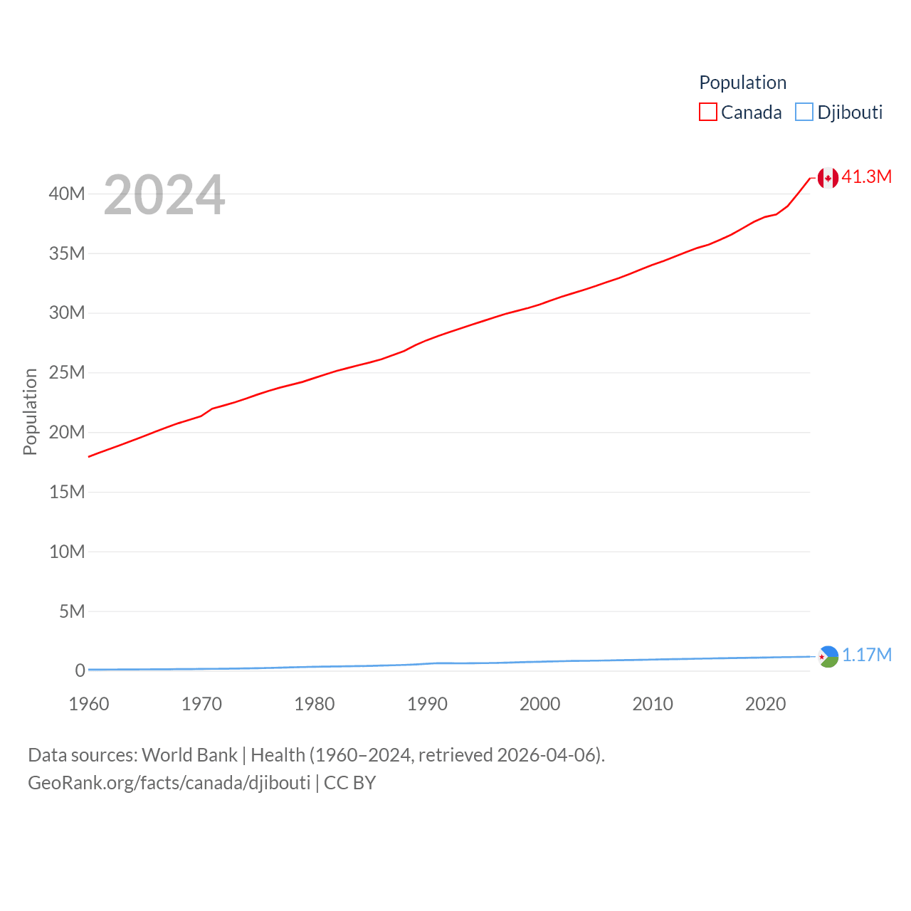 Canada has a population of 41.3M (ranked 37/197), compared with 1.17M in Djibouti (ranked 158/197). Canada's land area is 3,393,336 sq mi versus 8,950 sq mi for Djibouti (ranked 4th vs. 147th).