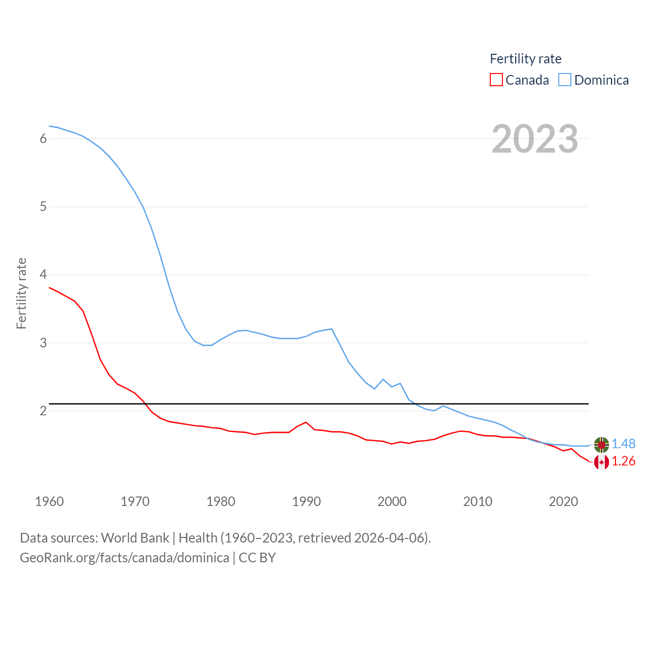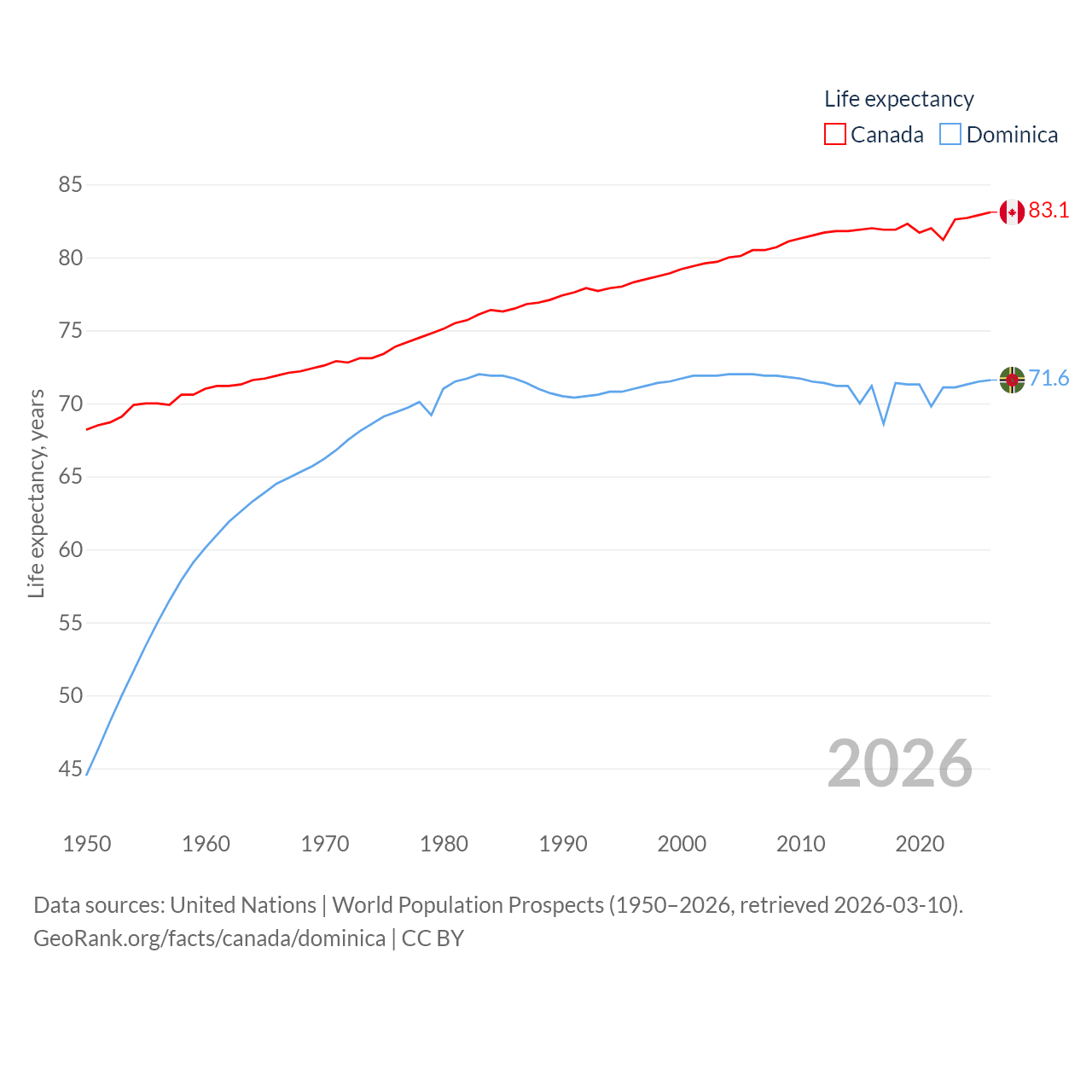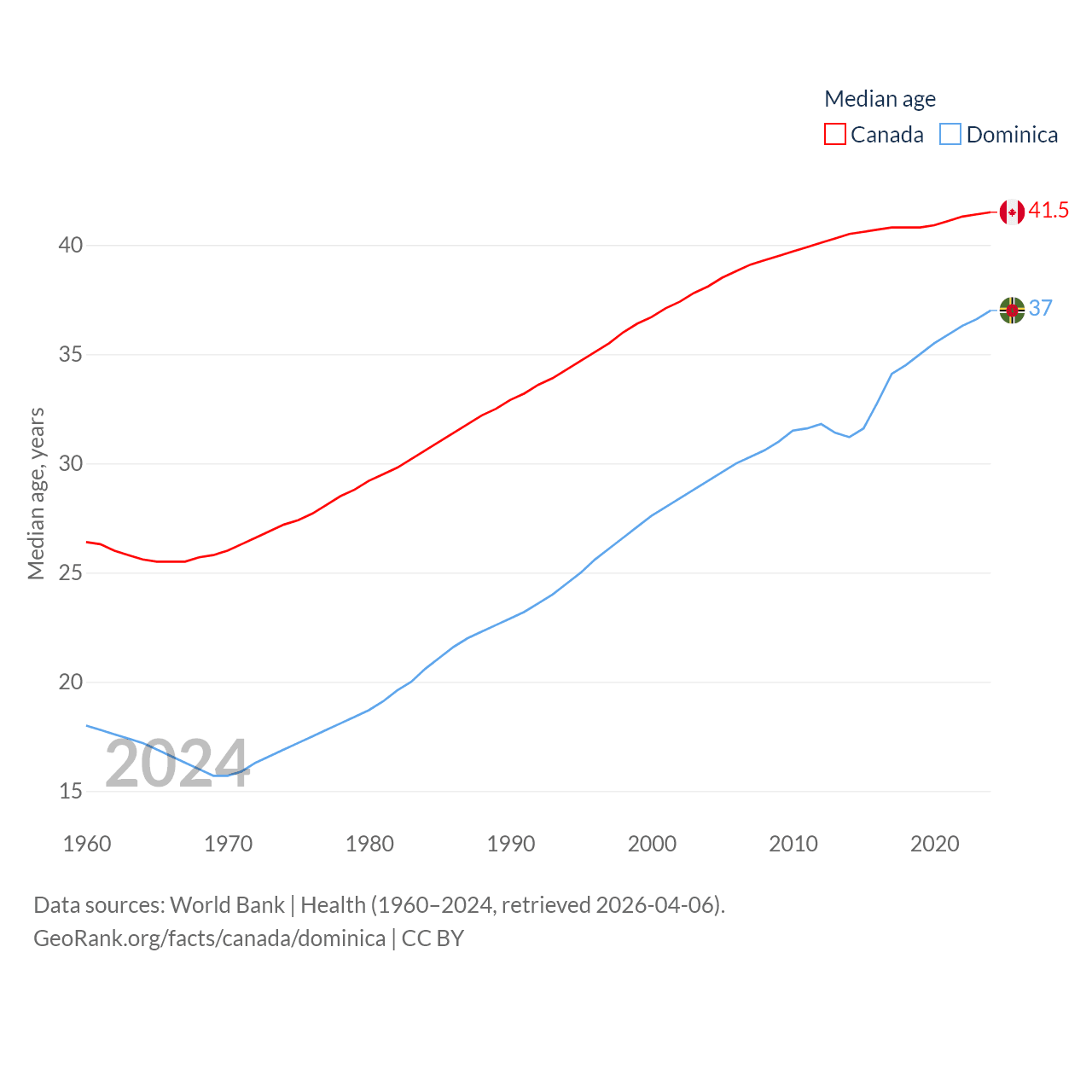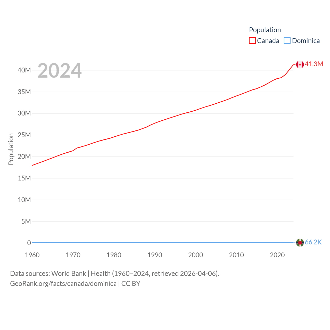 Canada has a population of 41.3M (ranked 37/197), compared with 66.2K in Dominica (ranked 188/197). Canada's land area is 3,393,336 sq mi versus 289.6 sq mi for Dominica (ranked 4th vs. 175th).