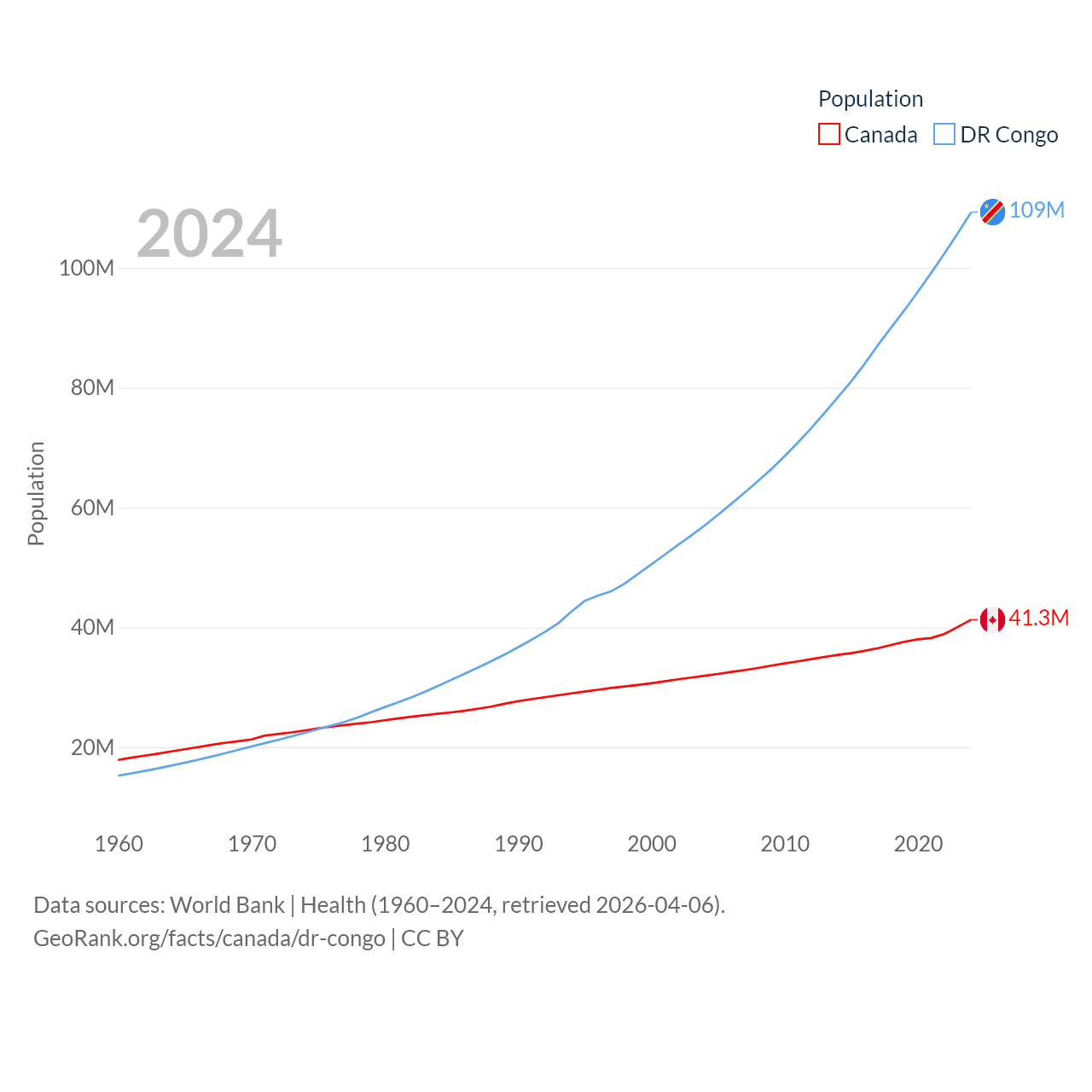 Canada has a population of 41.3M (ranked 37/197), compared with 109M in The DR Congo (ranked 15/197). Canada's land area is 3,393,336 sq mi versus 875,313 sq mi for The DR Congo (ranked 4th vs. 11th).