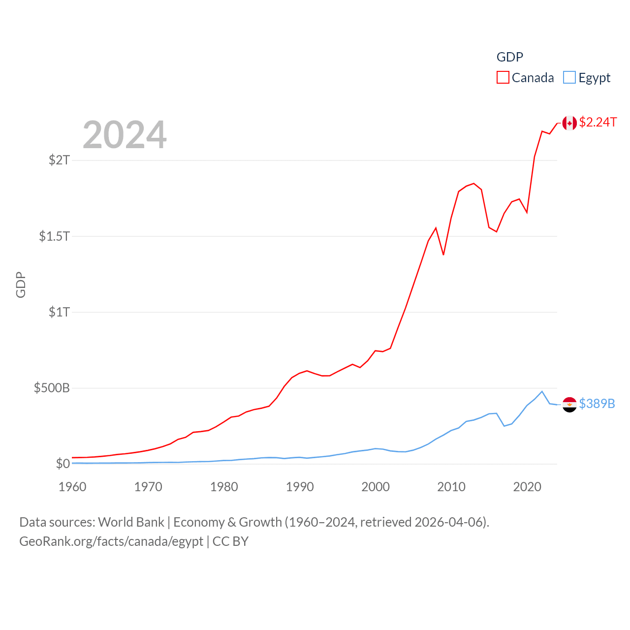 By GDP, Canada ranks 9/197 ($2.24T) and Egypt ranks 41/197 ($389B). By GDP per capita, Canada ranks 20/197 ($54,340), while Egypt ranks 138/197 ($3,338).