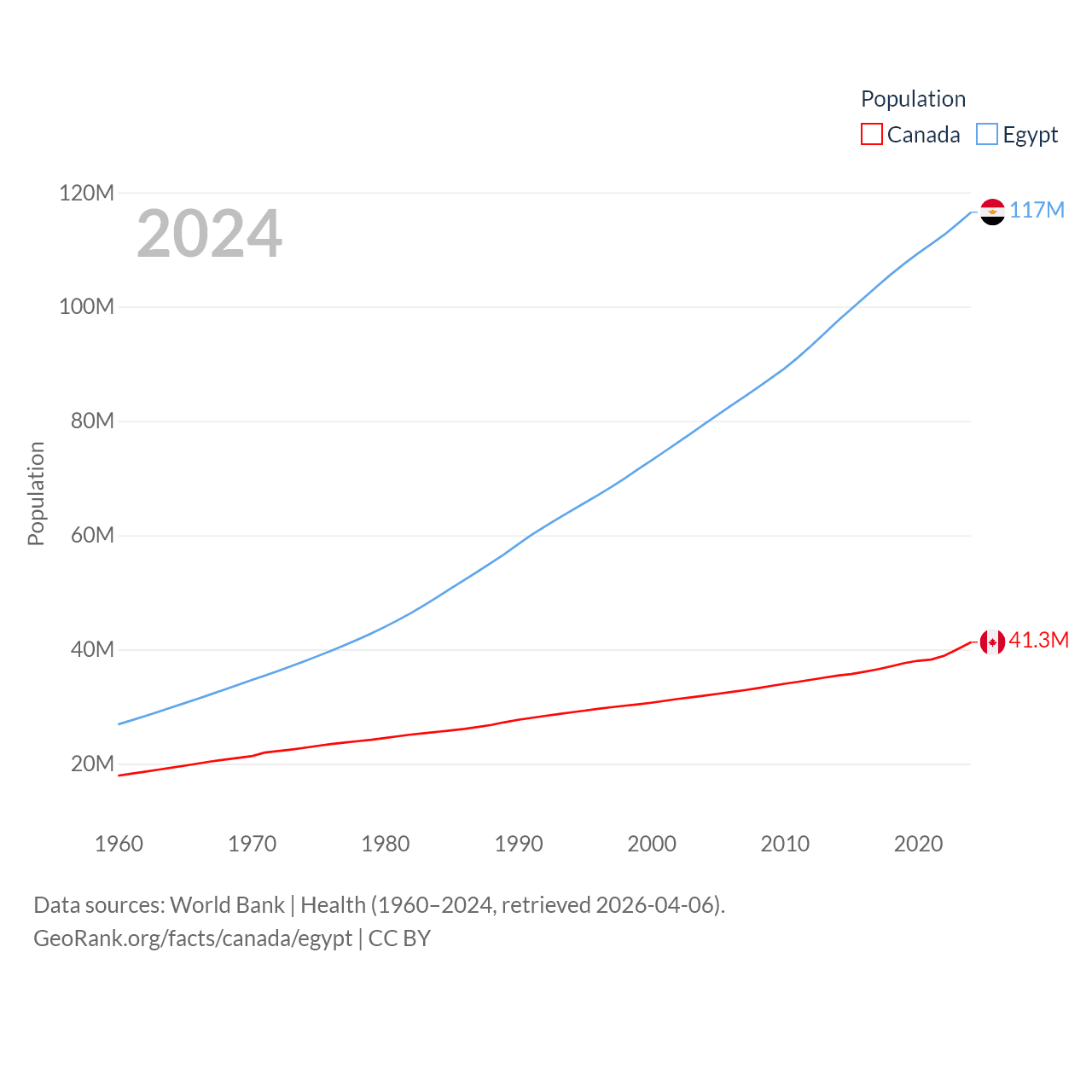 Canada has a population of 41.3M (ranked 37/197), compared with 117M in Egypt (ranked 13/197). Canada's land area is 3,393,336 sq mi versus 384,345 sq mi for Egypt (ranked 4th vs. 29th).